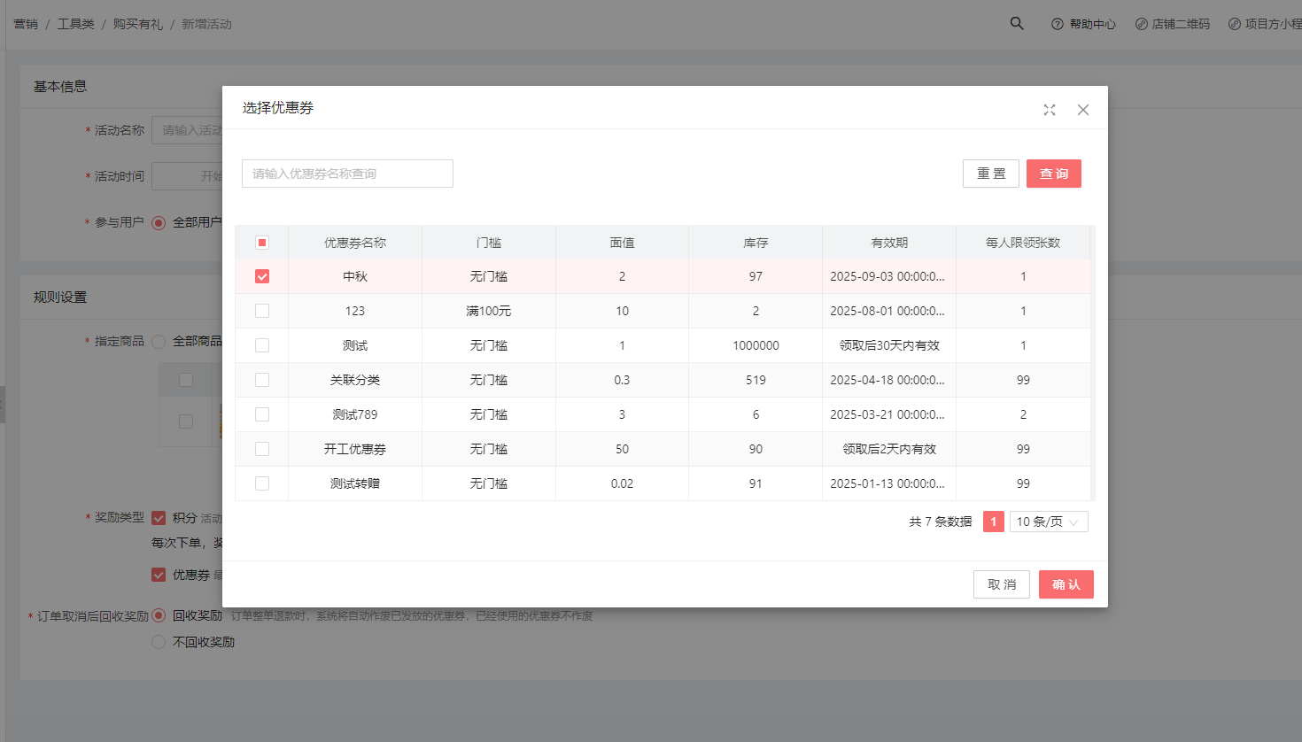 勾选优惠券,点击修改,即可选择已经创建好的优惠券。