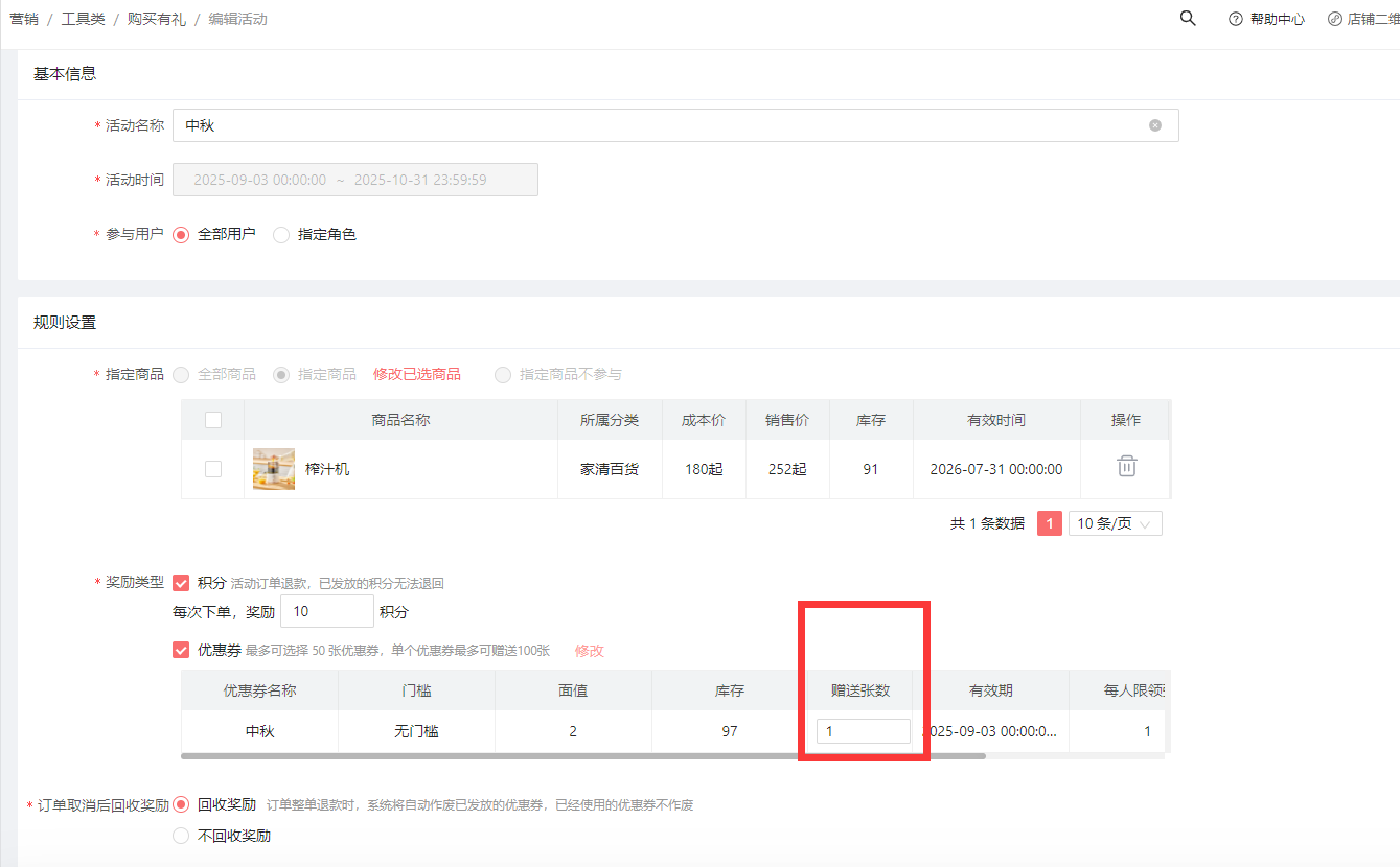 可以是单独积分,输入赠送积分的数值。(温馨提示:如有设置消费得积分的活动时,用户下一个订单,可以获得两次积分)