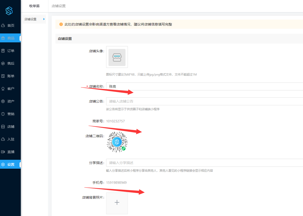 登陆后,在左边-设置里面可以看到所有的基本信息,店铺名称,头像,商家号,手机号码等等信息。