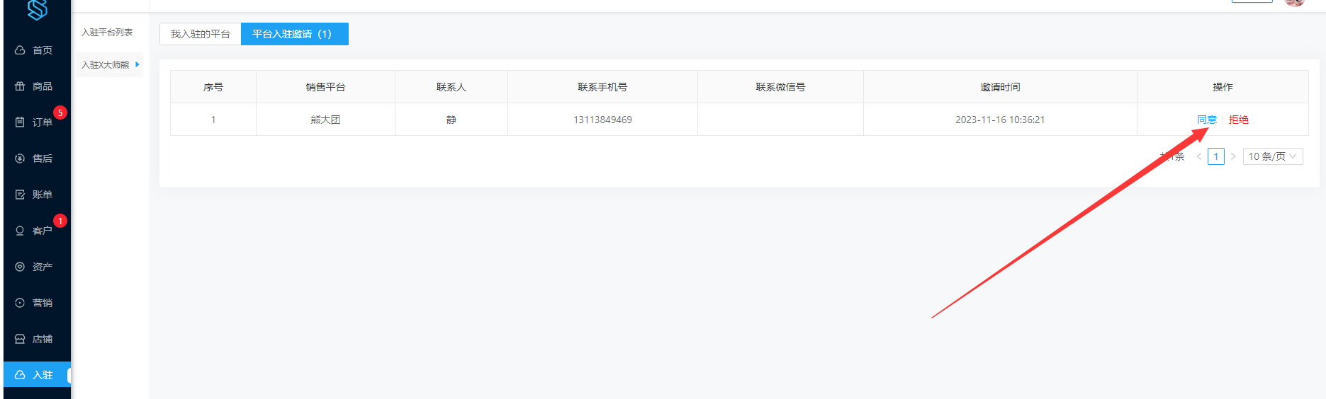 搜索进来后,右上角,点击“邀请入驻”输入联系人姓名和手机号码,提交,等待这个收单易商家在后台确认.