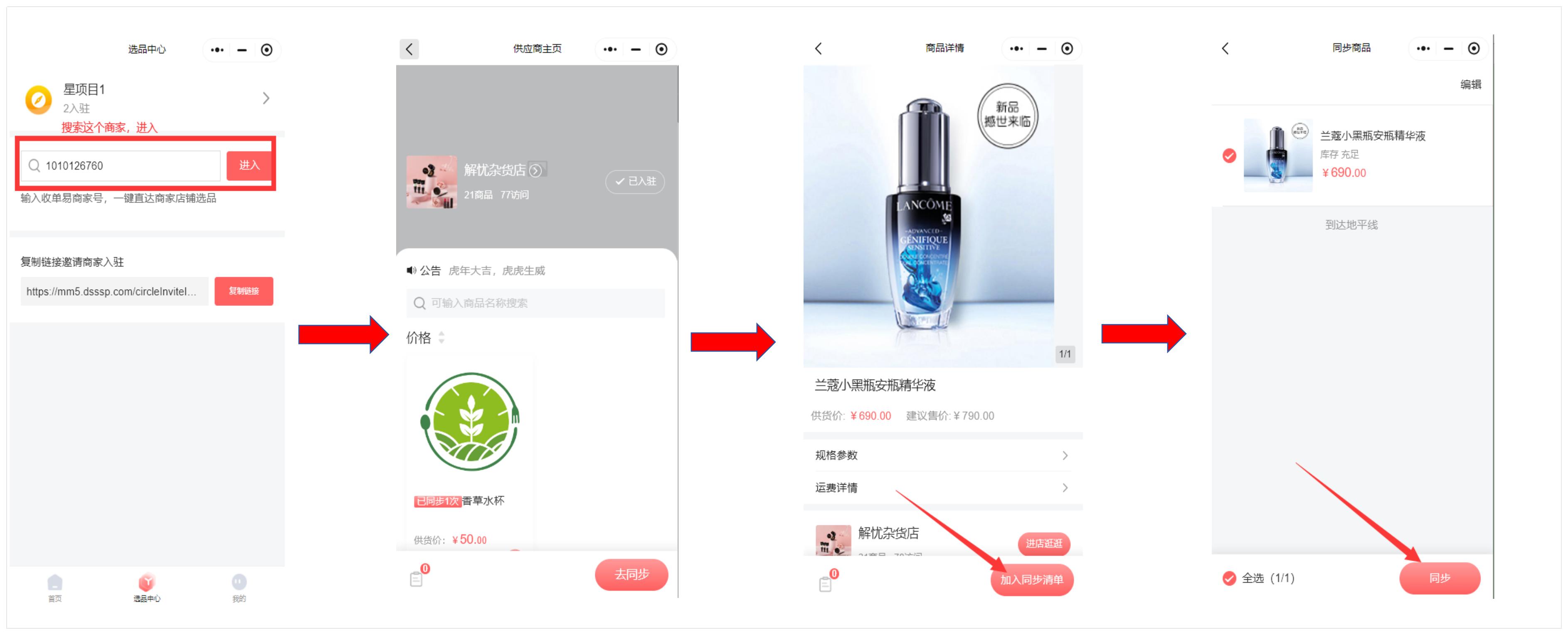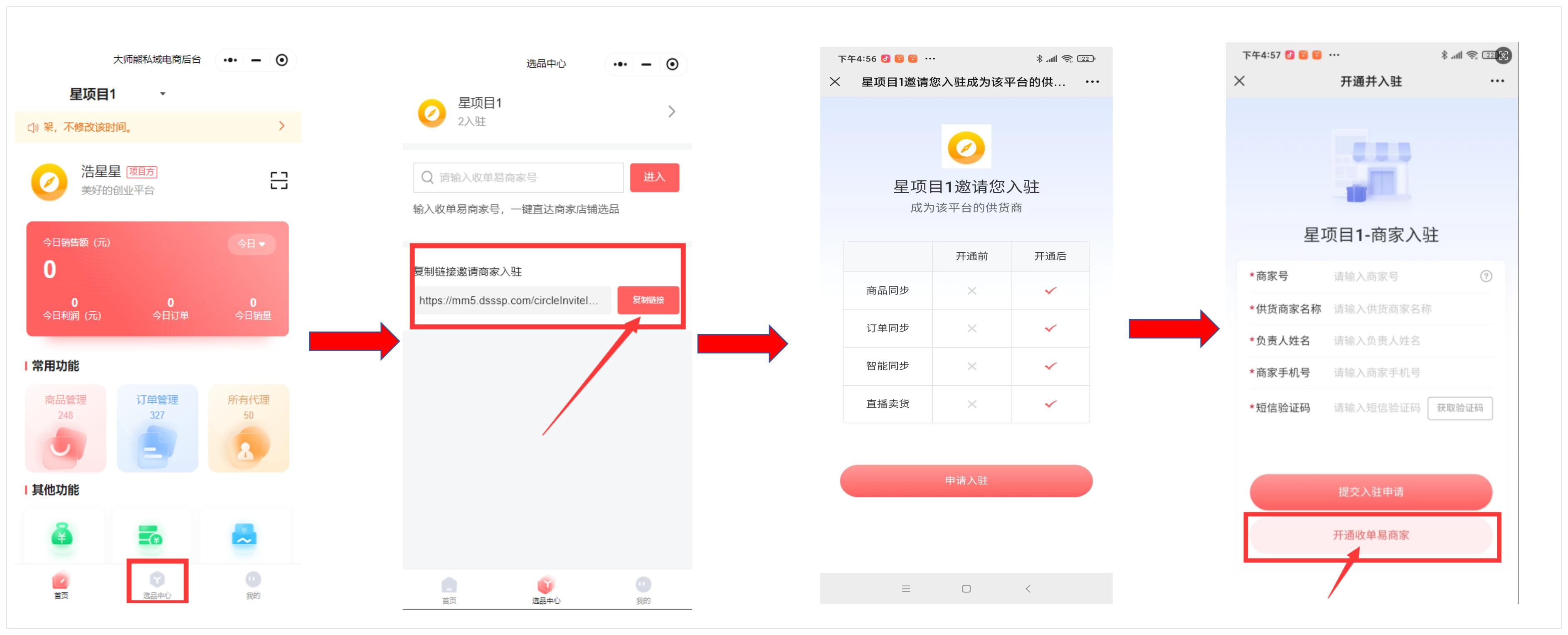 1.登陆手机端后台小程序,在选品中心-点击进去,按照如下流程: