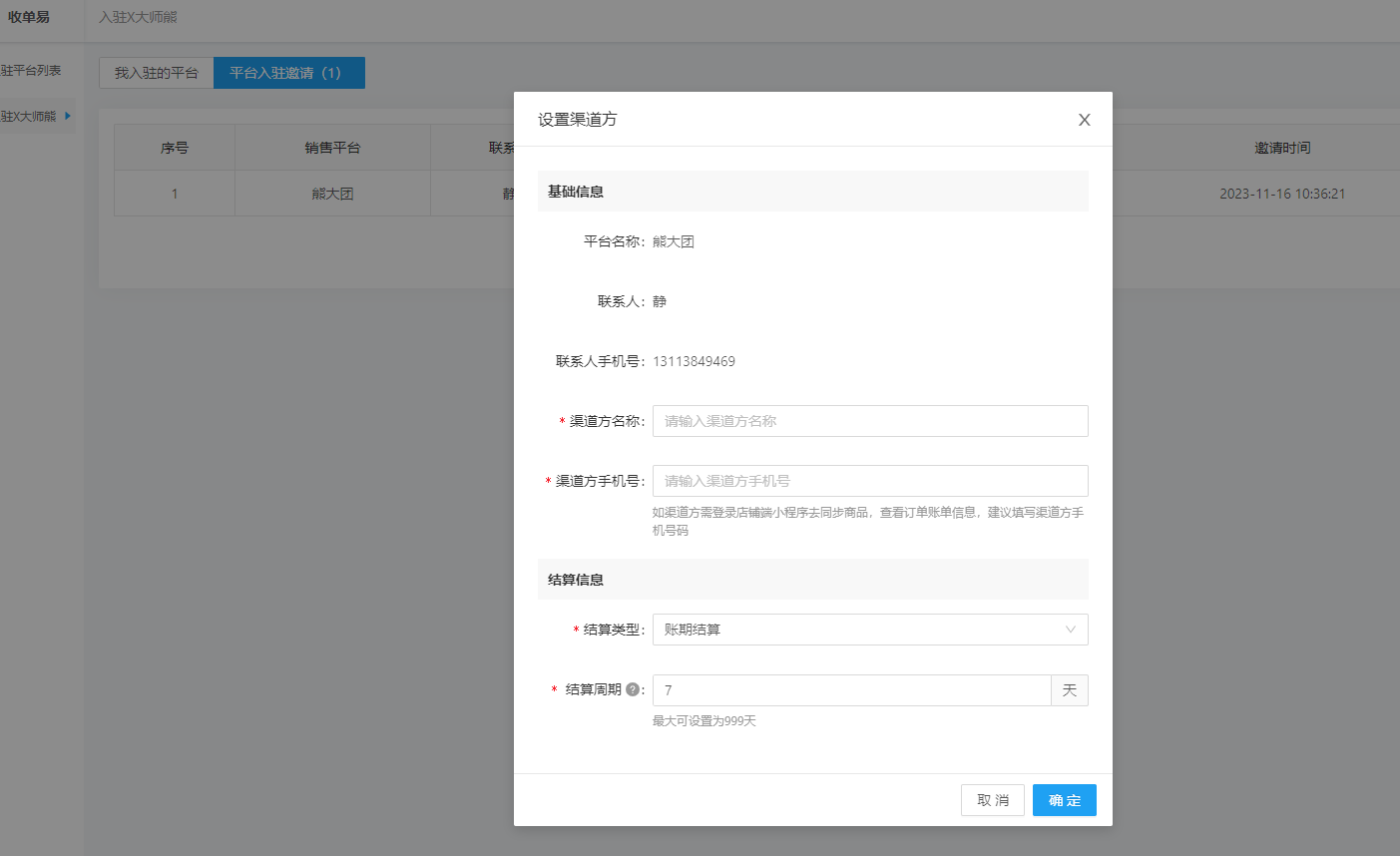 这里的渠道方,就是这个申请的团方,可以把团方的联系方式填写好,(可以提前和团方确认对方的联系方式)在填写上结算的周期,确定。