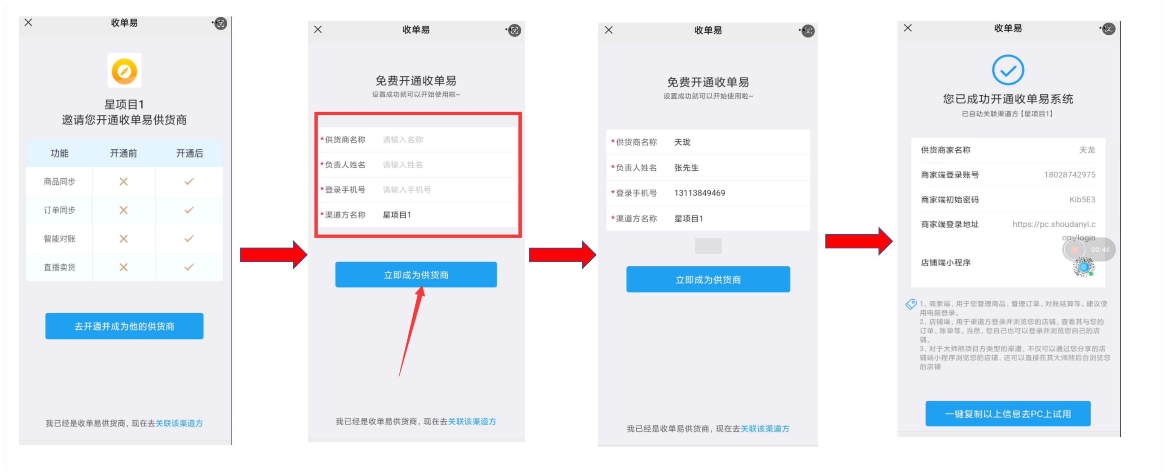 点开链接,点击申请入驻-开通收单易商家-去开通成并成为他的供应商-填写信息,举例如下: