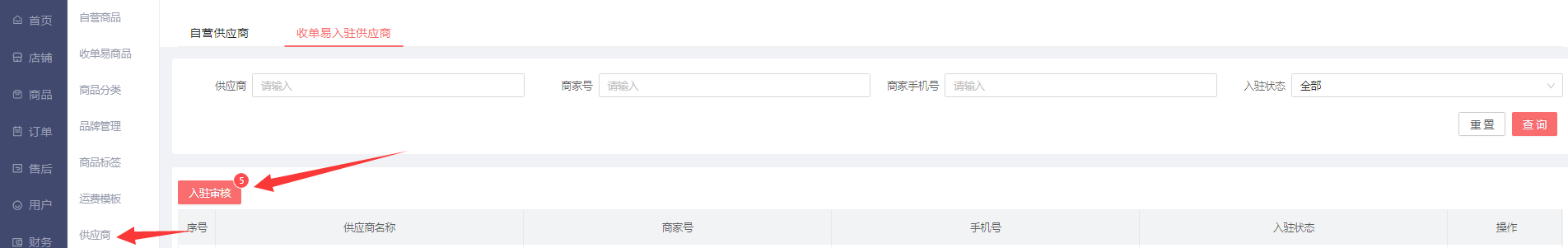 团方审核操作:在pc端(电脑端)后台-商品-供应商-收单易入驻供应商-点击入驻审核,就可以看到需要审核的供应商。