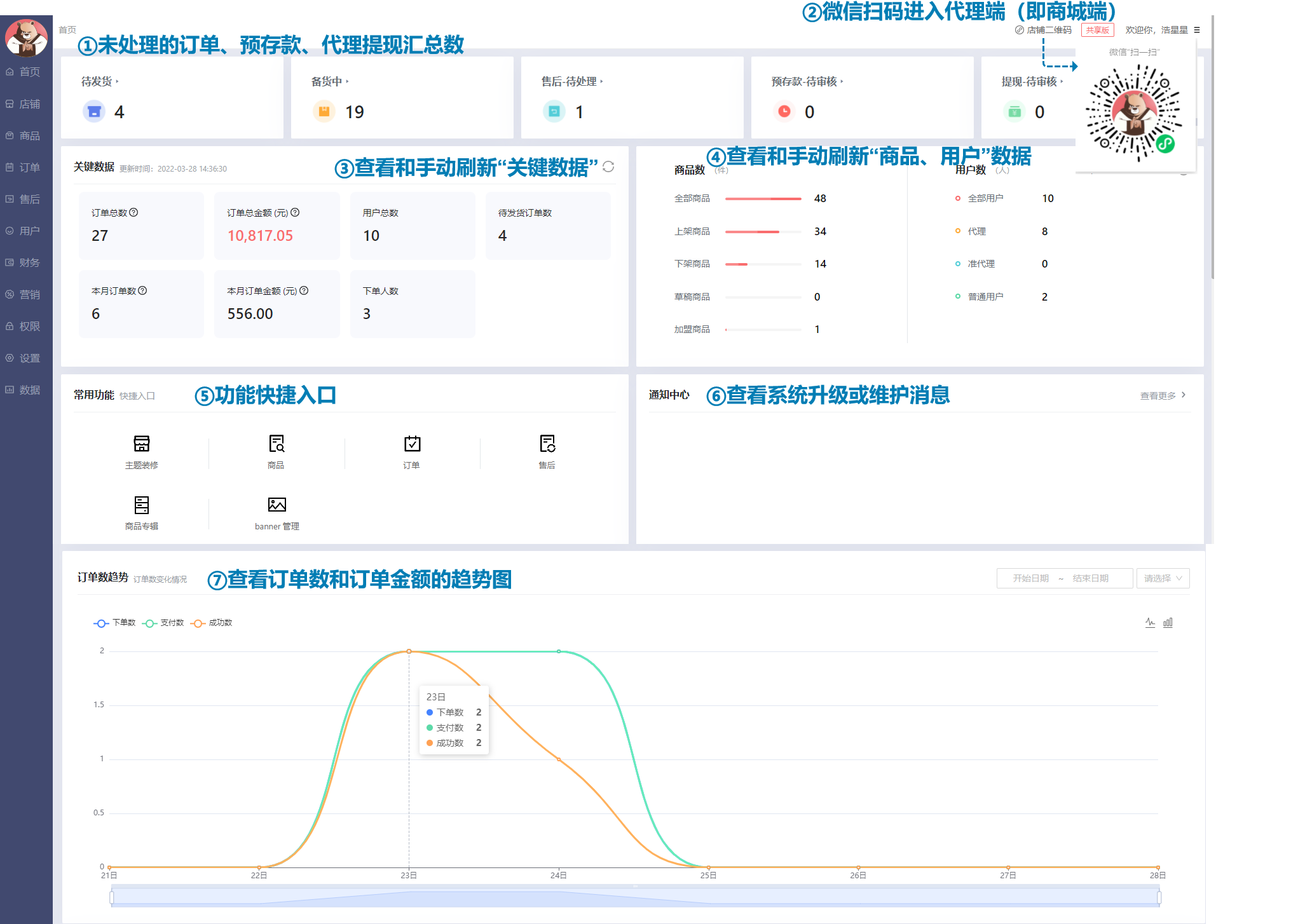 目录 搜索 展开 系统介绍管理端-PC首页看板店铺主题装修风格一商品专辑商品自营商品收单易商品商品分类品牌管理商品标签运费模板供应商仓库管理购买须知素材中心导出历史记录订单自营订单收单易订单收单易备货记录收单易异常订单视频号订单视频号异常订单备货记录导出记录快递单导入记录售后代理/用户 申请售后流程项目方后台申请售后流程售后列表售后地址管理导出历史记录用户代理列表注册用户考核准代理考核记录加盟审核黑/白名单导入用户导入用户历史操作日志财务用户奖金代理提现提现记录运营资金视频号资金池预存款审核预存款收单易账单直播视频号直播小程序直播播播熊直播小店带货机构机构商品机构分配达人佣金商家分配达人佣金合作商家商品合作内容合作合作达人商品合作内容合作合作品牌订单管理推客带货直播间短视频推客管理基础配置营销工具等级设置佣金设置系统设置视频号小店(微信小店)视频号分享营销商品类限时秒杀限时团购店铺类服务标签公告管理banner管理工具类优惠券积分中心活跃值排行榜跨境保税满包邮分享有礼积分兑换弹窗广告满减满送满赠日历签到购买有礼注册有礼储值有礼换购平台服务退换无忧补贴标准权限员工管理角色管理数据业绩统计商品统计设置项目设置代理关系平台展业分享设置代理设置代理须知设置升/降级设置商品设置订单设置售后设置客服设置奖金设置基础奖金单品团队奖团队业绩奖代理提现设置(独立版)项目方提现设置独立版提现非独立版提现加盟商品页设置操作日志管理端-小程序订单管理商品管理代理余额运营资金奖金支出所有代理订单网络同级网络推荐网络加盟审核代理排行榜预存款选品中心小程序直播退换无忧代理端-小程序我的订单奖金团队业绩工具 暂无相关搜索结果! view_count:637 本文档使用 MinDoc 发布 首页看板 首页:针对该项目整体数据的概括:作者:admin 创建时间:2022-03-28 12:14最后编辑:admin 更新时间:2026-03-31 17:07