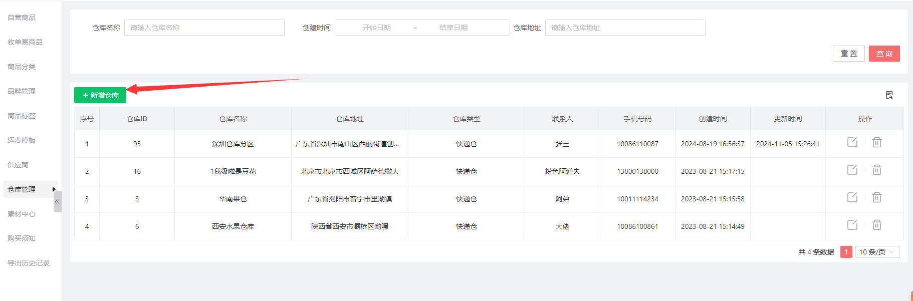 目录 搜索 展开 系统介绍管理端-PC首页看板店铺主题装修风格一商品专辑商品自营商品收单易商品商品分类品牌管理商品标签运费模板供应商仓库管理购买须知素材中心导出历史记录订单自营订单收单易订单收单易备货记录收单易异常订单视频号订单视频号异常订单备货记录导出记录快递单导入记录售后代理/用户 申请售后流程项目方后台申请售后流程售后列表售后地址管理导出历史记录用户代理列表注册用户考核准代理考核记录加盟审核黑/白名单导入用户导入用户历史操作日志财务用户奖金代理提现提现记录运营资金视频号资金池预存款审核预存款收单易账单直播视频号直播小程序直播播播熊直播小店带货机构机构商品机构分配达人佣金商家分配达人佣金合作商家商品合作内容合作合作达人商品合作内容合作合作品牌订单管理推客带货直播间短视频推客管理基础配置营销工具等级设置佣金设置系统设置视频号小店(微信小店)视频号分享营销商品类限时秒杀限时团购店铺类服务标签公告管理banner管理工具类优惠券积分中心活跃值排行榜跨境保税满包邮分享有礼积分兑换弹窗广告满减满送满赠日历签到购买有礼注册有礼储值有礼换购平台服务退换无忧补贴标准权限员工管理角色管理数据业绩统计商品统计设置项目设置代理关系平台展业分享设置代理设置代理须知设置升/降级设置商品设置订单设置售后设置客服设置奖金设置基础奖金单品团队奖团队业绩奖代理提现设置(独立版)项目方提现设置独立版提现非独立版提现加盟商品页设置操作日志管理端-小程序订单管理商品管理代理余额运营资金奖金支出所有代理订单网络同级网络推荐网络加盟审核代理排行榜预存款选品中心小程序直播退换无忧代理端-小程序我的订单奖金团队业绩工具 暂无相关搜索结果! view_count:165 本文档使用 MinDoc 发布 仓库管理 仓库管理:即该项目自己有仓库,从自己的仓库发出的商品,需要新增这个仓库的信息:新增自建仓 需要注意,在新增时需要关联商品的运费模板 红色型号是必填的哦其他的信息就和新增供应商信息基本一致。作者:admin 创建时间:2023-03-03 11:06最后编辑:admin 更新时间:2026-03-31 17:07