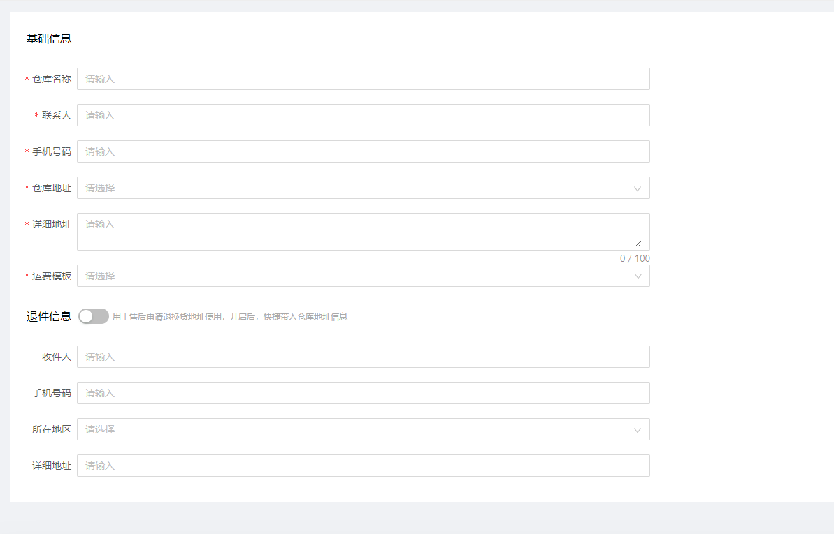 仓库管理:即该项目自己有仓库,从自己的仓库发出的商品,需要新增这个仓库的信息:新增自建仓 需要注意,在新增时需要关联商品的运费模板 红色型号是必填的哦其他的信息就和新增供应商信息基本一致。作者:admin 创建时间:2023-03-03 11:06最后编辑:admin 更新时间:2026-03-31 17:07