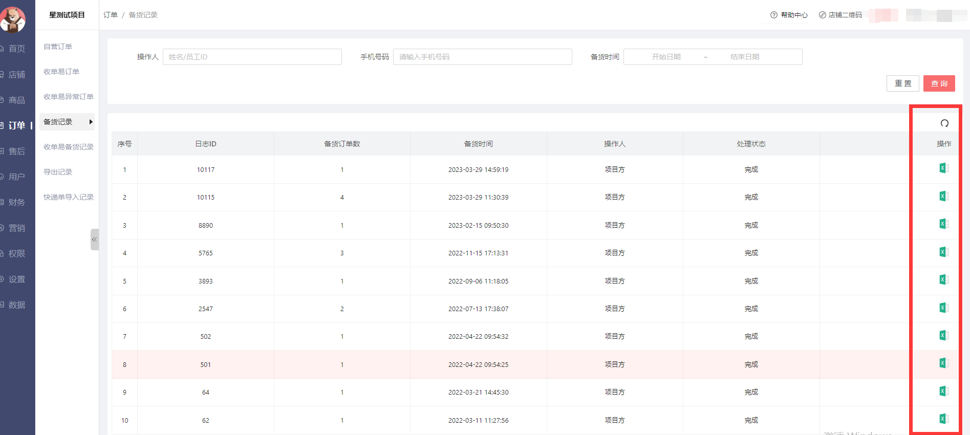 从备货记录页面可以看到之前所有备货的记录,并且可以导出表格