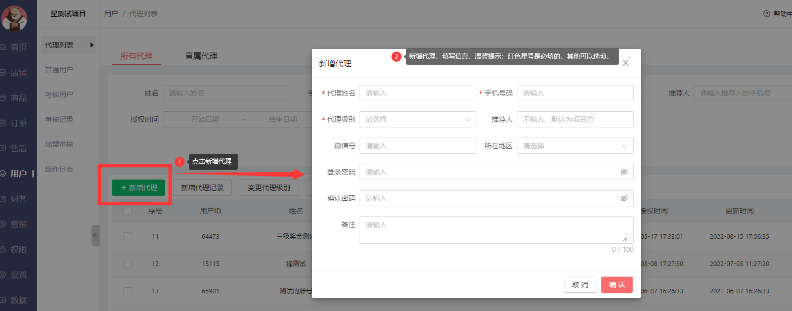 新增代理:由项目方或者管理员手动增加的代理,(如果有需要批量导入系统的代理名单的话,可以发给我们批量导入系统)。具体模板表格联系我们提供。