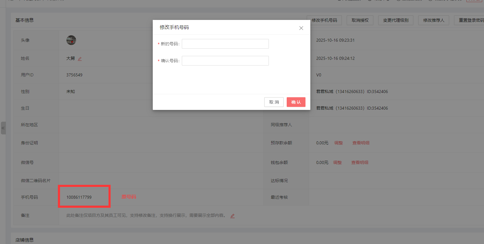 1.提供的要修改的新号码,一定是在系统中没有注册过的,没有注册过代理,也没有注册过注册用户身份的,可以直接修改。