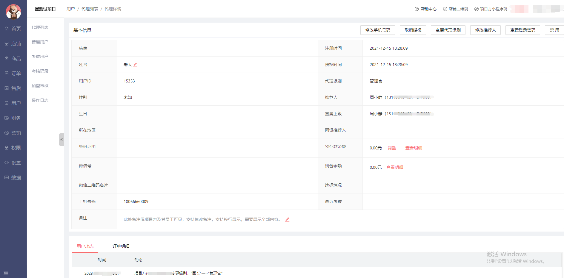 可以更改手机号码,手动取消代理身份,变更过代理级别,修改推荐人,重置登陆密码,禁用