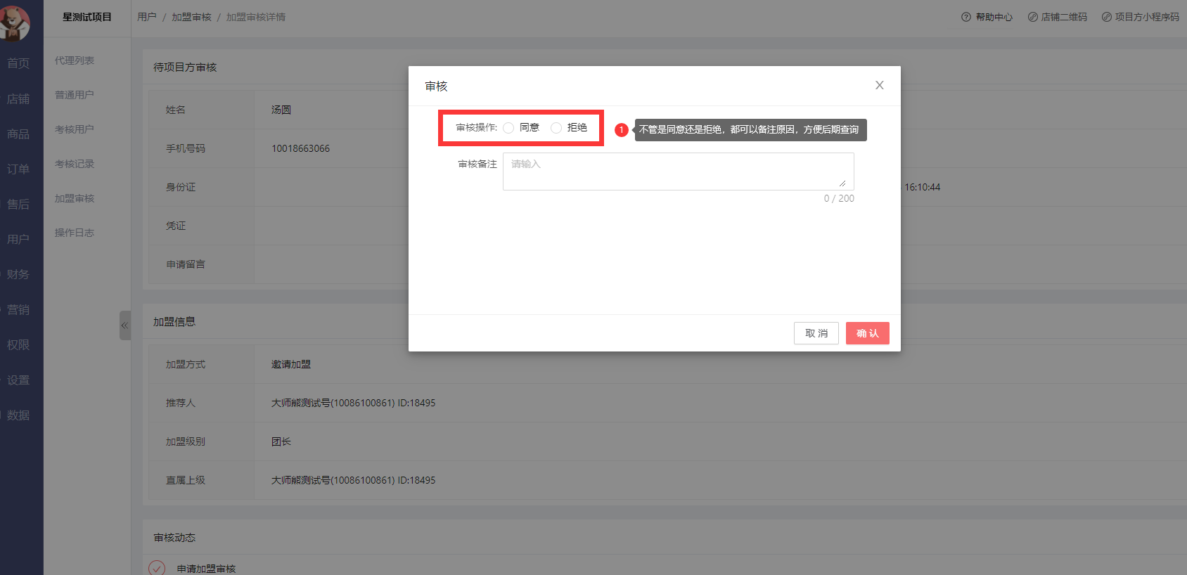 目录 搜索 展开 系统介绍管理端-PC首页看板店铺主题装修风格一商品专辑商品自营商品收单易商品商品分类品牌管理商品标签运费模板供应商仓库管理购买须知素材中心导出历史记录订单自营订单收单易订单收单易备货记录收单易异常订单视频号订单视频号异常订单备货记录导出记录快递单导入记录售后代理/用户 申请售后流程项目方后台申请售后流程售后列表售后地址管理导出历史记录用户代理列表注册用户考核准代理考核记录加盟审核黑/白名单导入用户导入用户历史操作日志财务用户奖金代理提现提现记录运营资金视频号资金池预存款审核预存款收单易账单直播视频号直播小程序直播播播熊直播小店带货机构机构商品机构分配达人佣金商家分配达人佣金合作商家商品合作内容合作合作达人商品合作内容合作合作品牌订单管理推客带货直播间短视频推客管理基础配置营销工具等级设置佣金设置系统设置视频号小店(微信小店)视频号分享营销商品类限时秒杀限时团购店铺类服务标签公告管理banner管理工具类优惠券积分中心活跃值排行榜跨境保税满包邮分享有礼积分兑换弹窗广告满减满送满赠日历签到购买有礼注册有礼储值有礼换购平台服务退换无忧补贴标准权限员工管理角色管理数据业绩统计商品统计设置项目设置代理关系平台展业分享设置代理设置代理须知设置升/降级设置商品设置订单设置售后设置客服设置奖金设置基础奖金单品团队奖团队业绩奖代理提现设置(独立版)项目方提现设置独立版提现非独立版提现加盟商品页设置操作日志管理端-小程序订单管理商品管理代理余额运营资金奖金支出所有代理订单网络同级网络推荐网络加盟审核代理排行榜预存款选品中心小程序直播退换无忧代理端-小程序我的订单奖金团队业绩工具 暂无相关搜索结果! view_count:117 本文档使用 MinDoc 发布 加盟审核 加盟审核通过代理发送邀请链接,用户点击邀请链接注册后,需要项目方或者代理审核的用户。列表显示如下: 点击详情可以操作审核: 点击最终审核,会弹出二次确认的页面。 最后,确定。确定同意后,这个用户就会自动出现在考核用户列表中,同时在代理列表,显示的是准团长。作者:admin 创建时间:2023-03-09 11:54最后编辑:admin 更新时间:2026-03-31 17:07