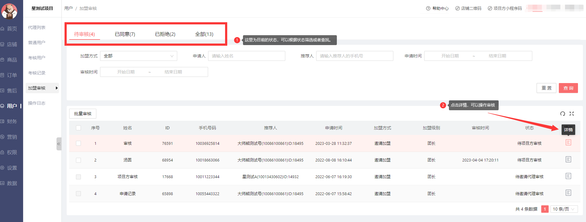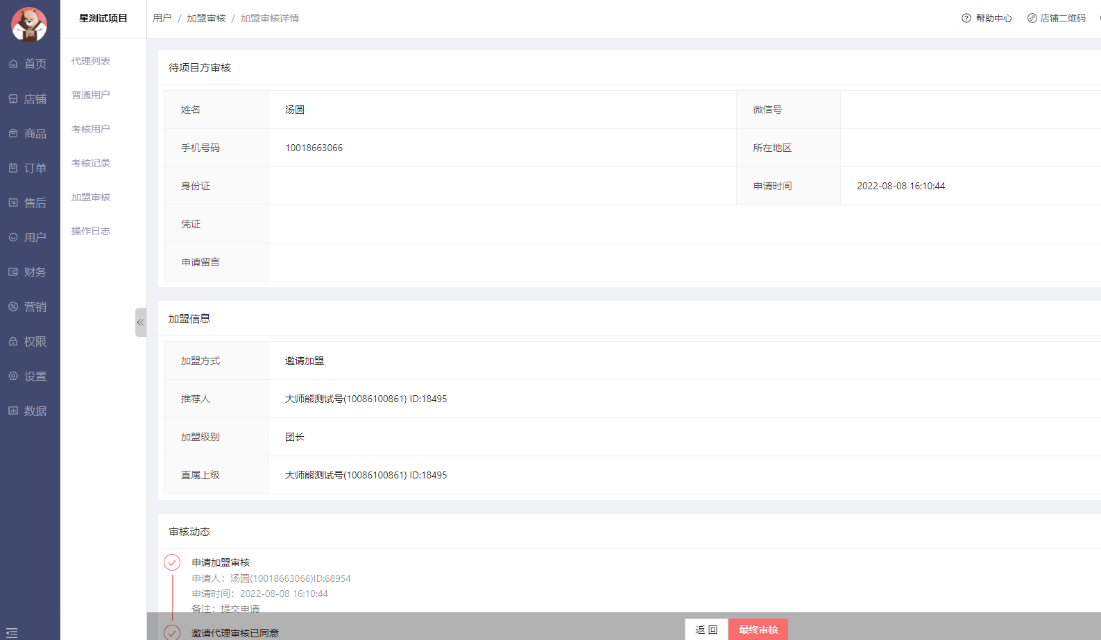 加盟审核通过代理发送邀请链接,用户点击邀请链接注册后,需要项目方或者代理审核的用户。列表显示如下: 点击详情可以操作审核: 点击最终审核,会弹出二次确认的页面。 最后,确定。确定同意后,这个用户就会自动出现在考核用户列表中,同时在代理列表,显示的是准团长。作者:admin 创建时间:2023-03-09 11:54最后编辑:admin 更新时间:2026-03-31 17:07