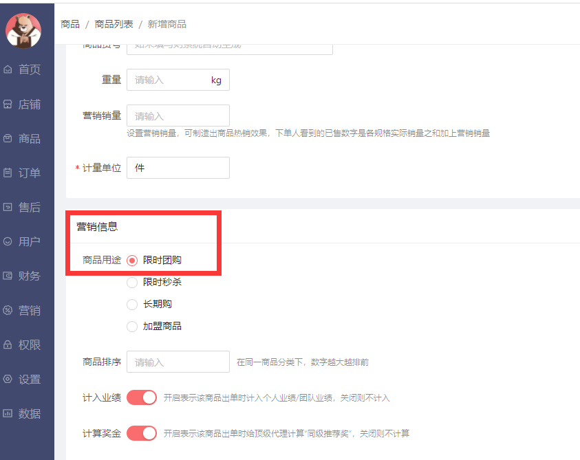 在商品-新增商品时,营销信息的商品用途中如勾选限时团购的话,此商品就会显示在限时团购这个列表中。