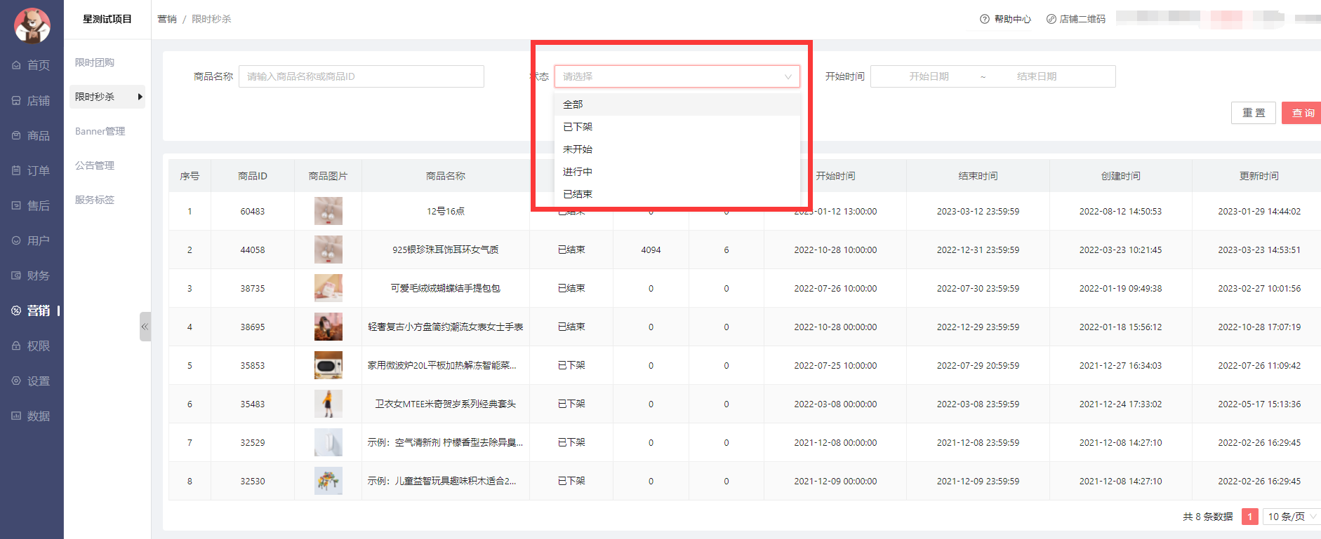 已结束:表示商品已经到下架结束时间的商品。