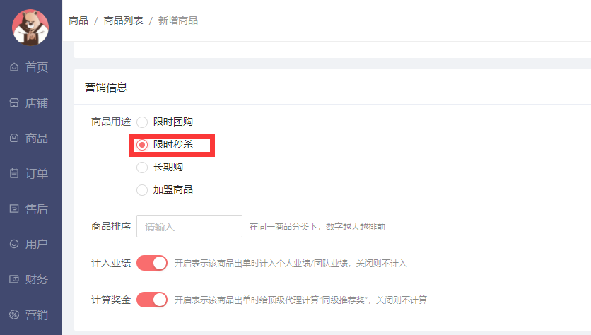 在商品-新增商品时,营销信息的商品用途中如勾选限时秒杀的话,此商品就会显示在限时秒杀这个列表中(即单独的秒杀通道)。