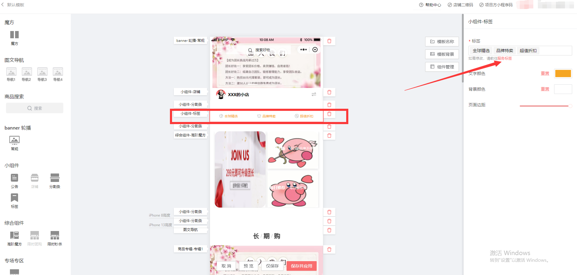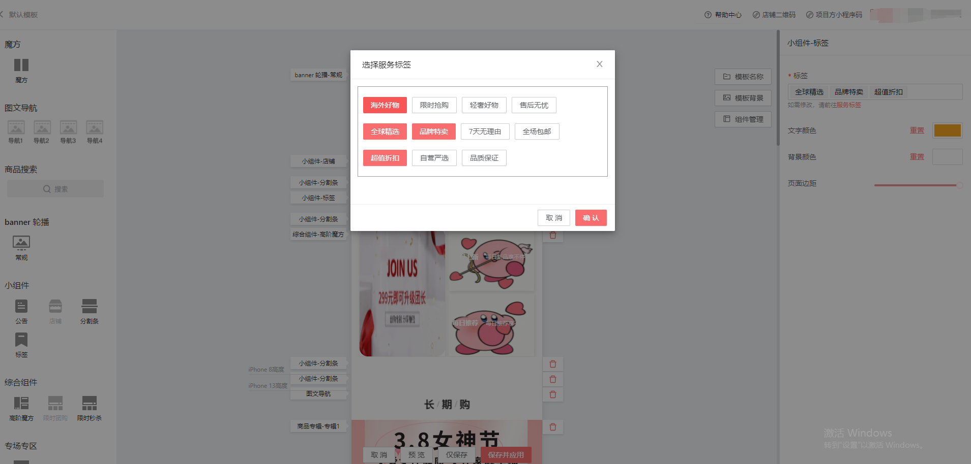 在店铺装修时以小组件-标签的形式展示在商城,通常会显示在首页banne轮播图下面,用以表示商城的特点。
