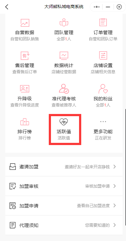 按钮开启后,会在用户端-我的,代理后台有活跃值入口显示。