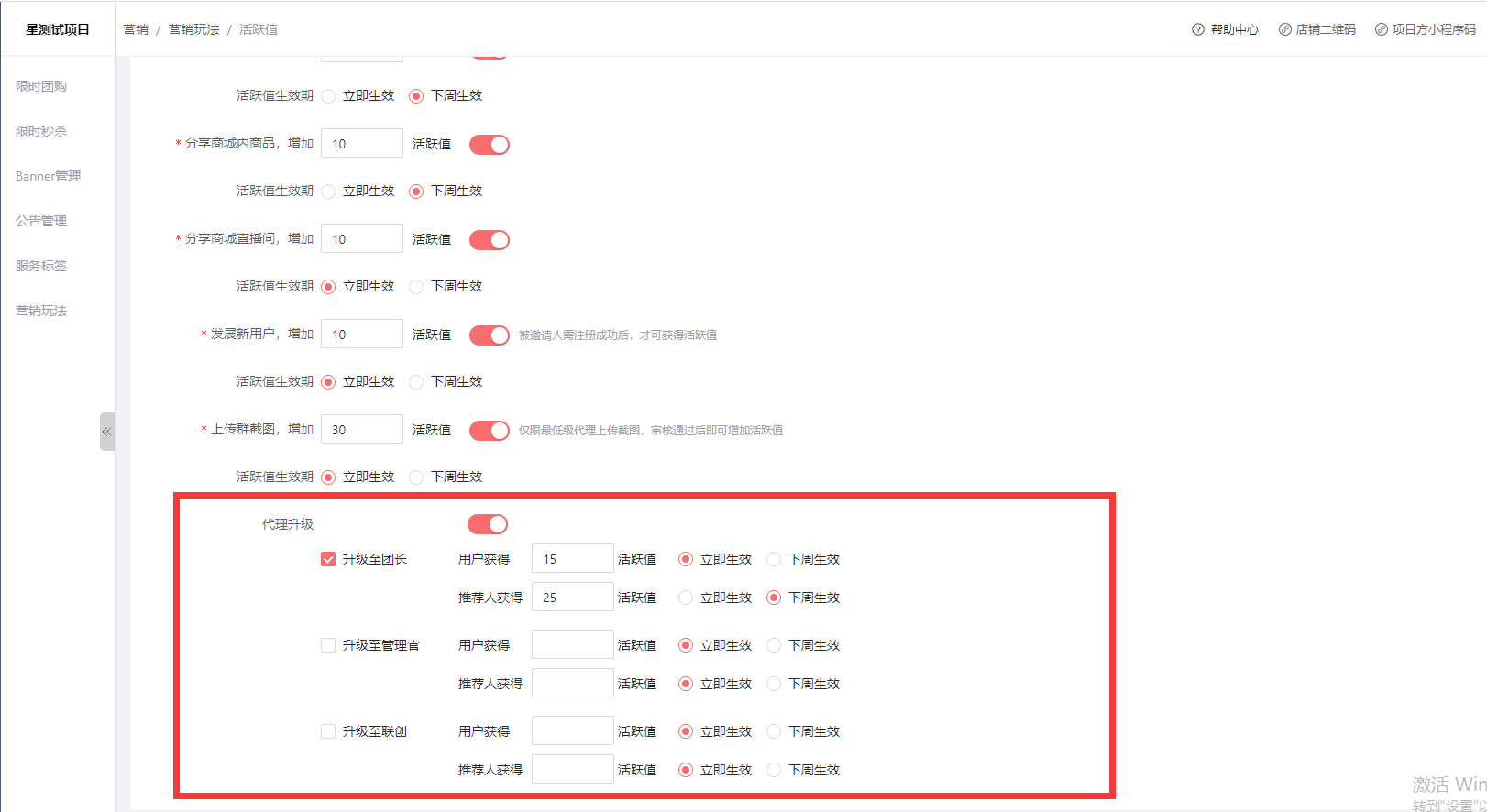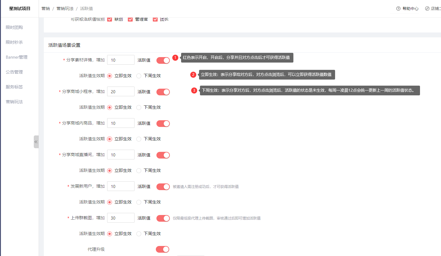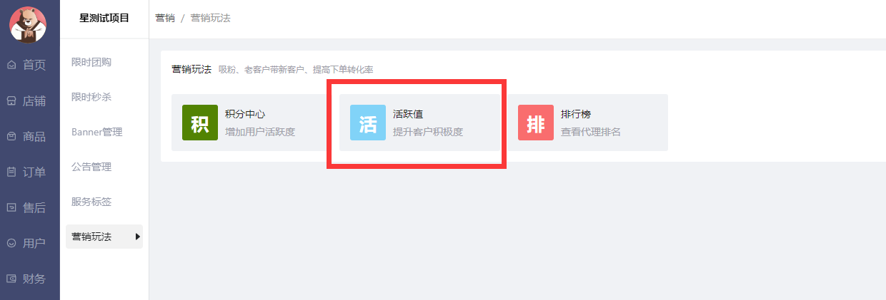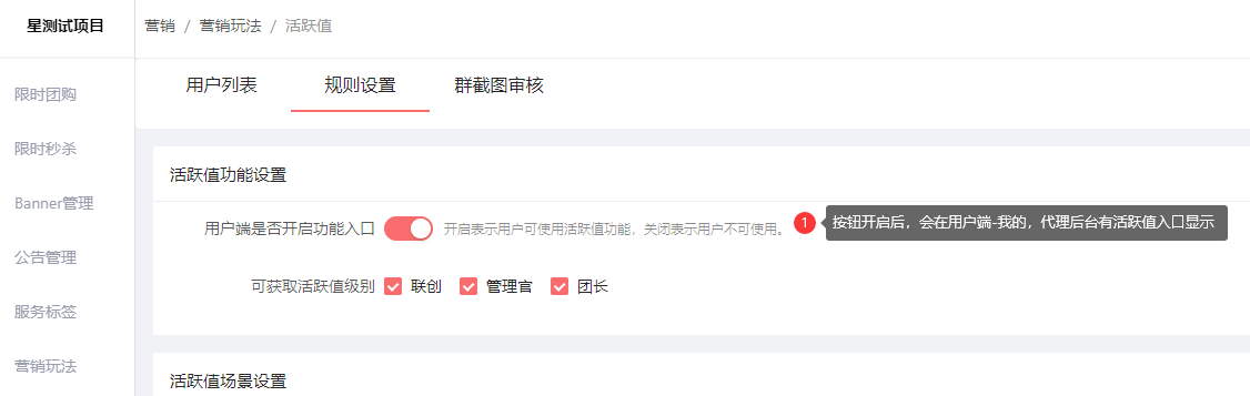 活跃值设置:营销-营销玩法-活跃值