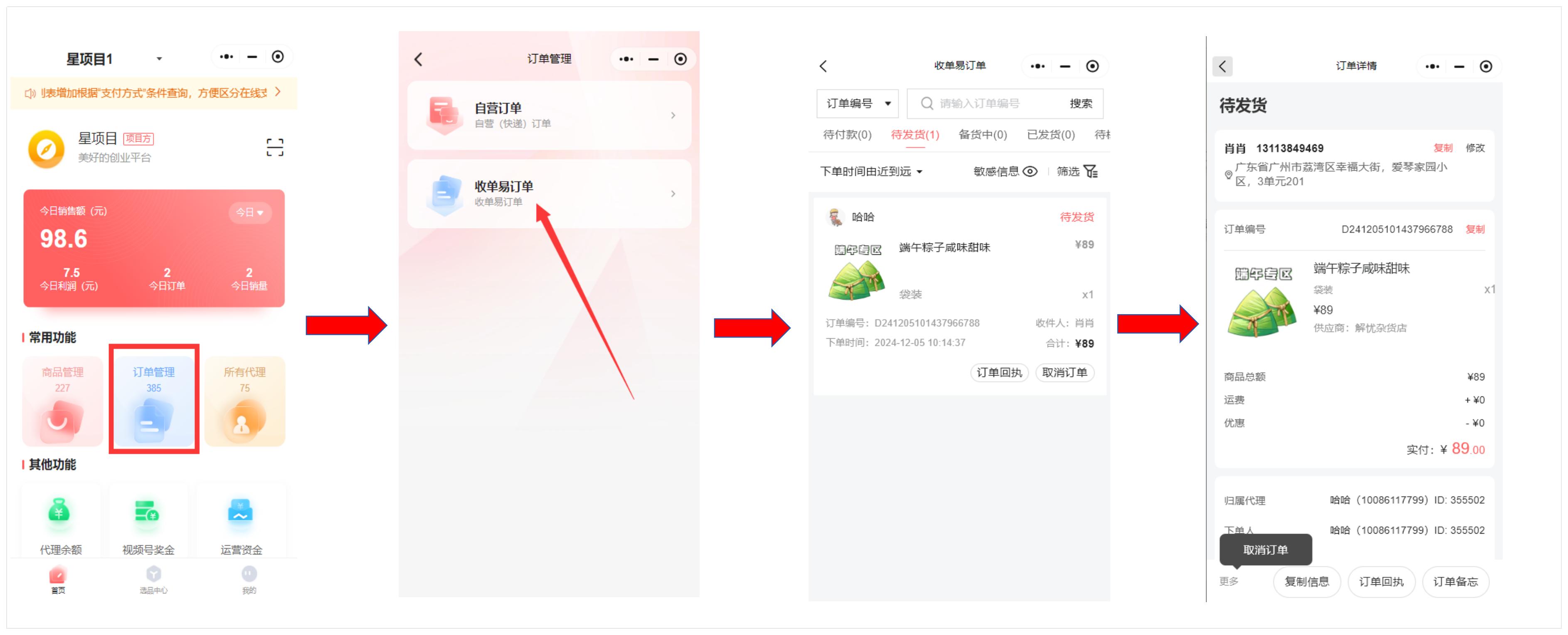 收单易订单的和自营订单基本信息几乎是一致的,主要区别就在于,收单易商品的发货,是需要在PC端,批量操作备货的同时转发给对应的供应商商家,而在小程序后台端这里,就没有单独针对一个订单的发货按钮哦!