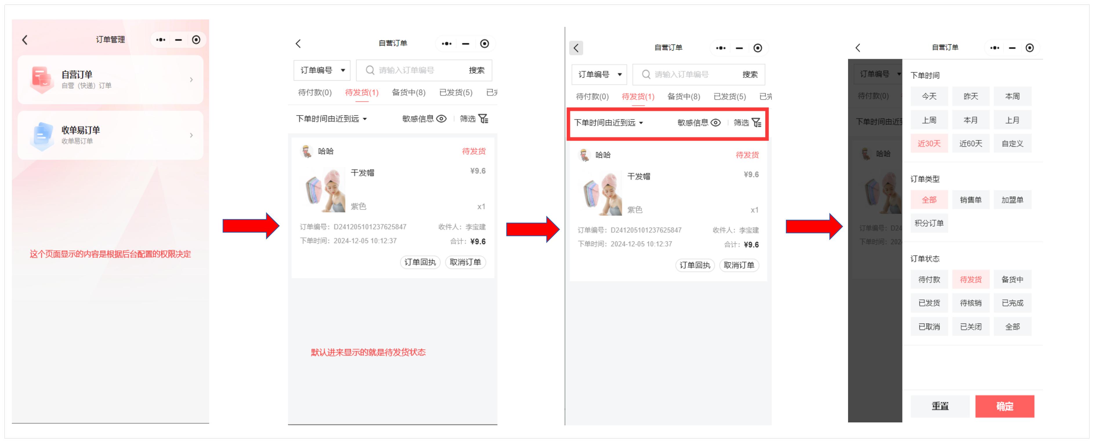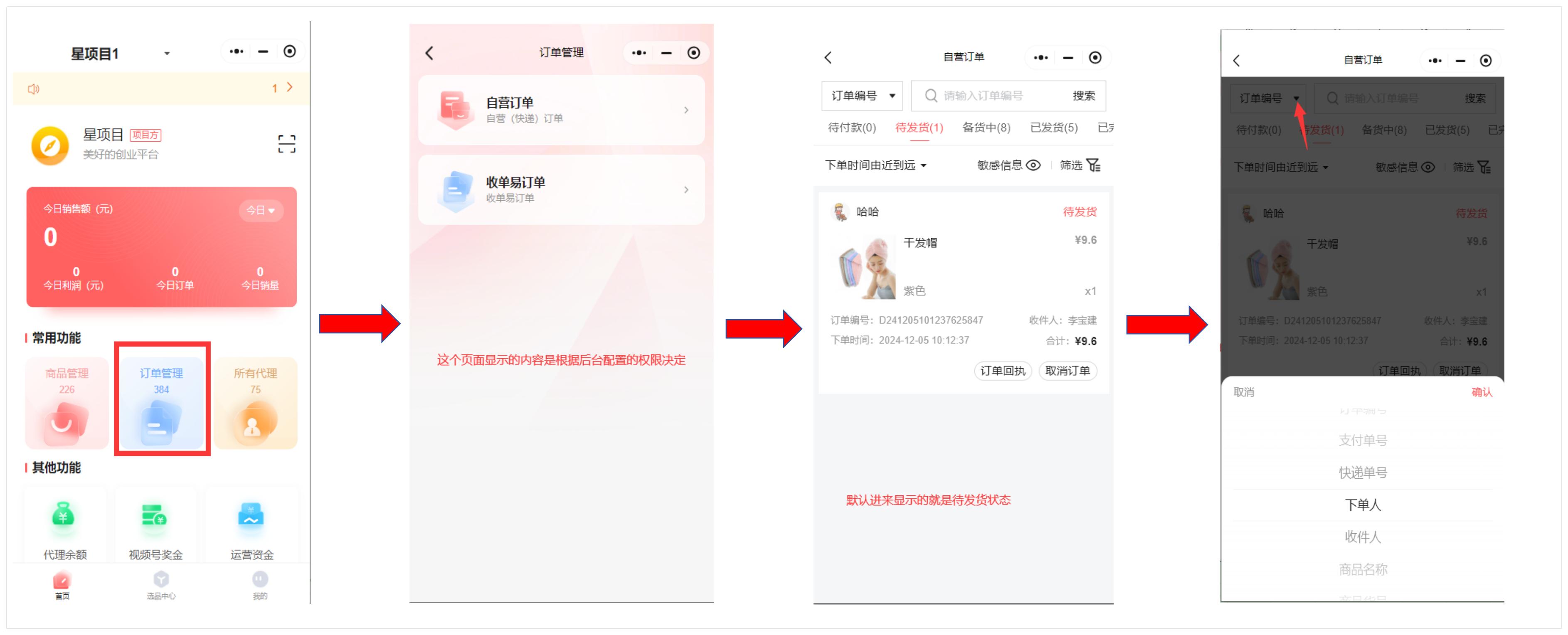 小程序后台端,首页,订单管理-自营订单-具体截图如下: