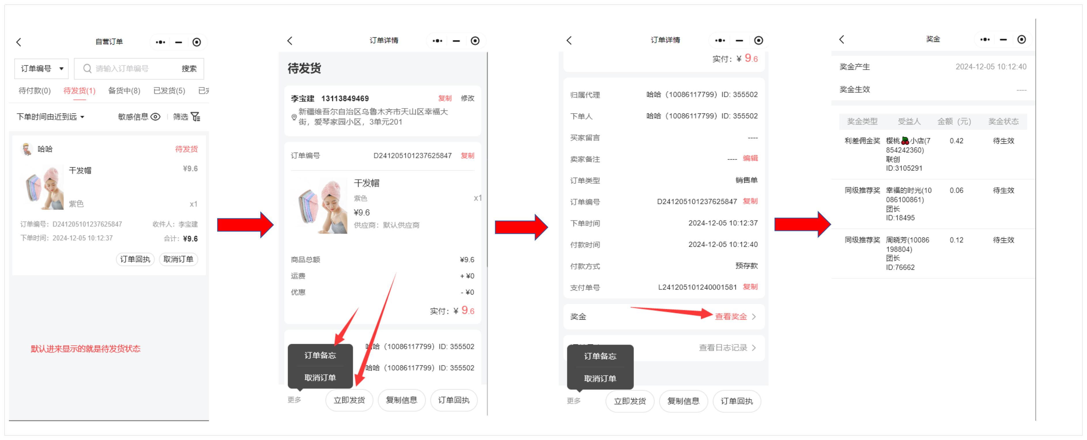 如点击某个订单进去,可以操作单独订单的发货,备注以及看到这个订单的奖金等详细内容。