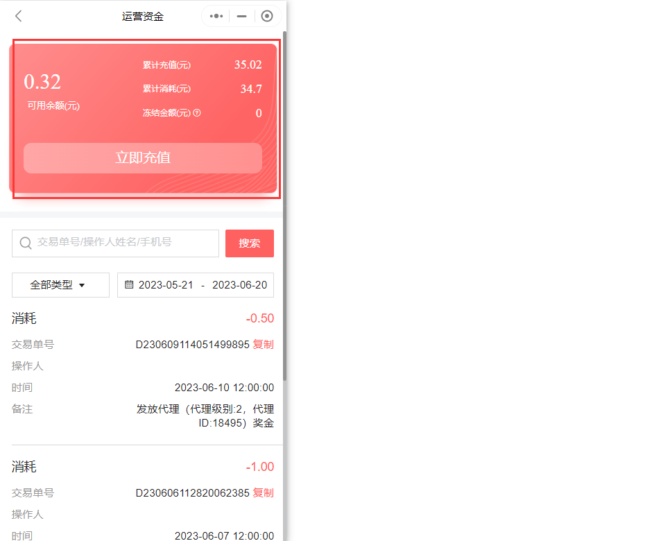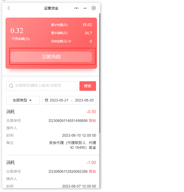当运营资金账户余额不足时,订单的奖金到了设置的生效时间,此时就需要充值运营资金。