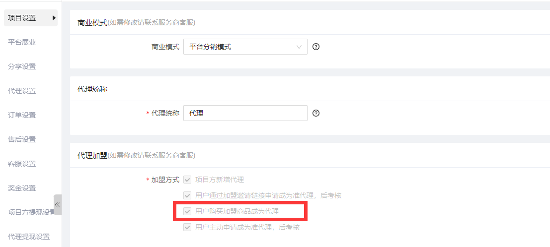 1.如何设置开启入口:在项目设置-代理加盟-加盟方式-用户购买加盟商品成为代理,需要勾选,截图如下: