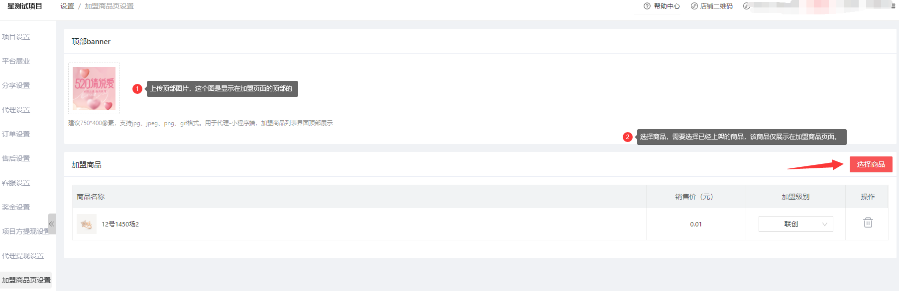 加盟商品页设置: