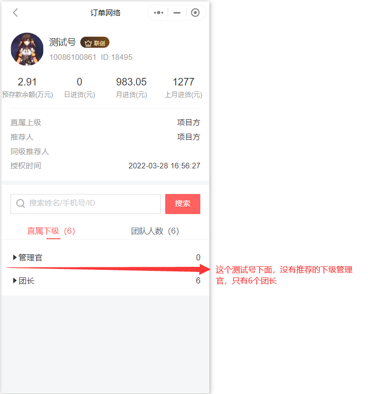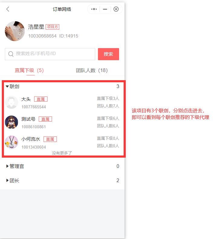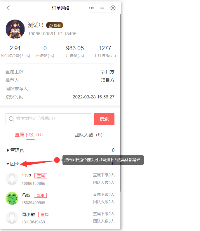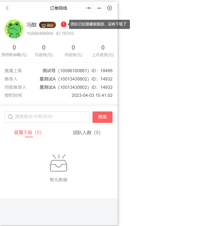 订单网络:即后台查看代理上级和下级之间的推荐关系的功能。举例:如该项目有3个级别,分别是最高级:联创,中级:管理官,最低级:团长。在订单网络中,可以查看联创这个级别人,推荐了几个中级管理官,还可以查看推荐了几个最低级团长等代理.截图如下:举例:点击查看“测试号”这个代理下面的有几个管理官和团长这个测试号下面没有推荐的管理官,只有6个团长。 温馨提示:因为团长是该项目的最低级别,已经没有下级了,所以点击对应团长下面,都是空白的作者:admin 创建时间:2023-06-06 10:18最后编辑:admin 更新时间:2026-03-31 17:07