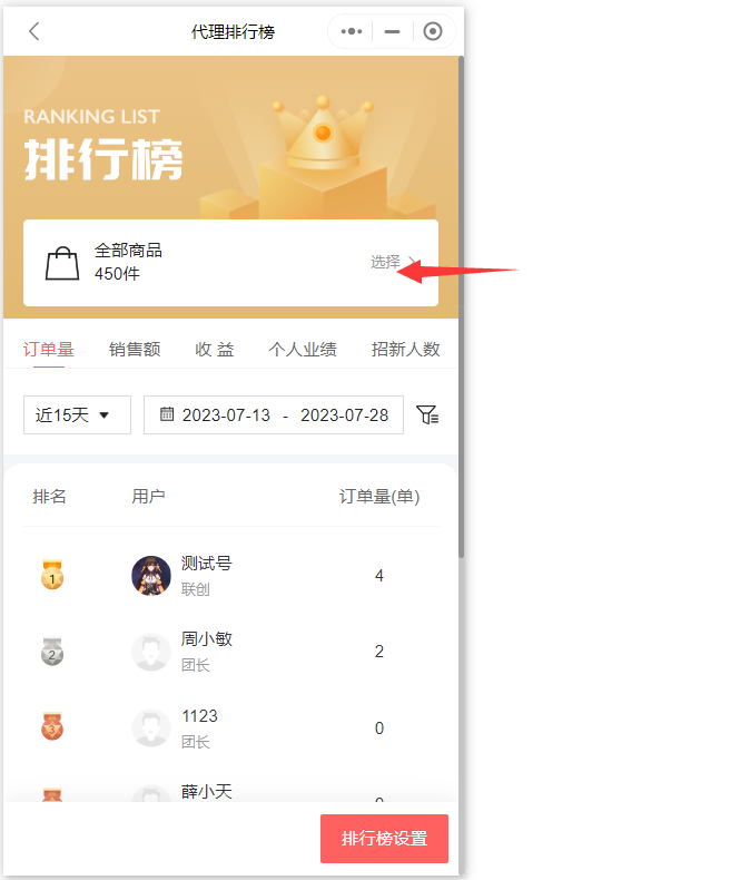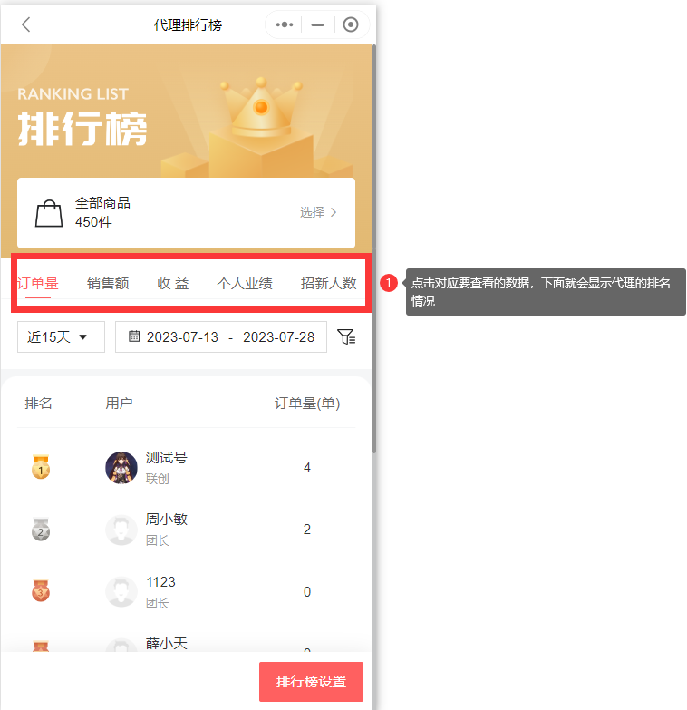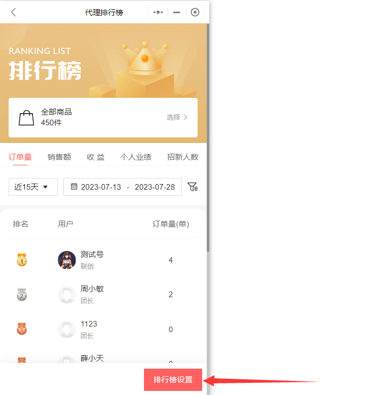 可以点击订单量,销售额,收益,个人业绩,以及招新人数,查看对应的代理排行情况