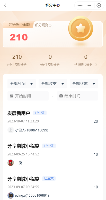 11.积分中心:即用户查询积分账户余额,以及获得积分的明细情况