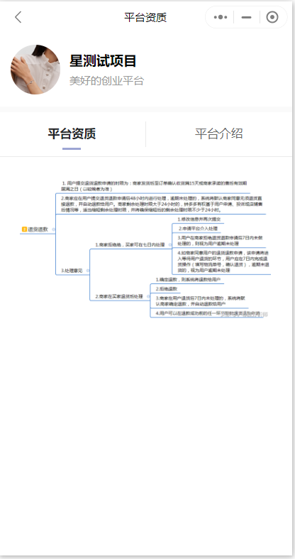 10.平台资质:即后台在-设置-平台展业-平台资质 上传的关于平台介绍的相关内容,而用户可以通过平台资质入口看到相关介绍,方便了解平台规则。