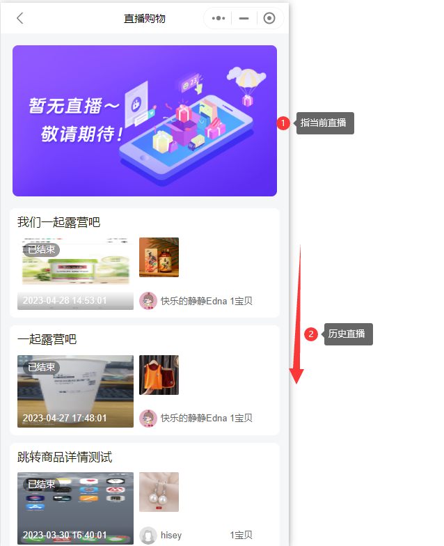 2.直播购物:可以通过直播购物入口进入直播列表,观看当前直播,或者会看之前的直播