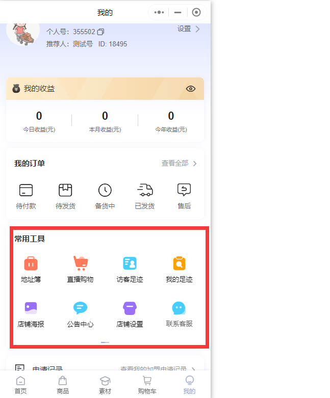 即我的页面(针对登陆代理身份)-常用工具,目前常用工具后台可以设置调整排序哦