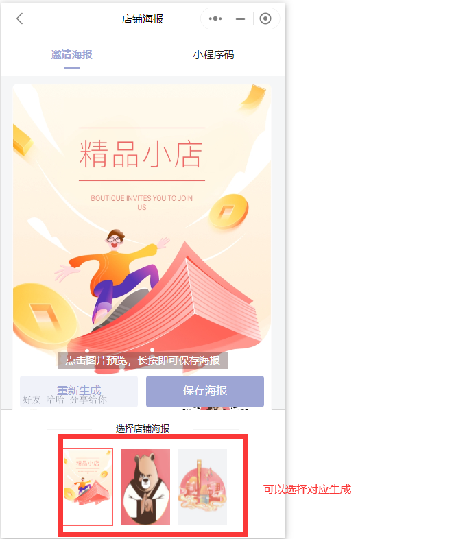 5.店铺海报:即当前登陆的代理,生成店铺海报,或者店铺小程序码的功能(此功能是代理身份才有的哦)