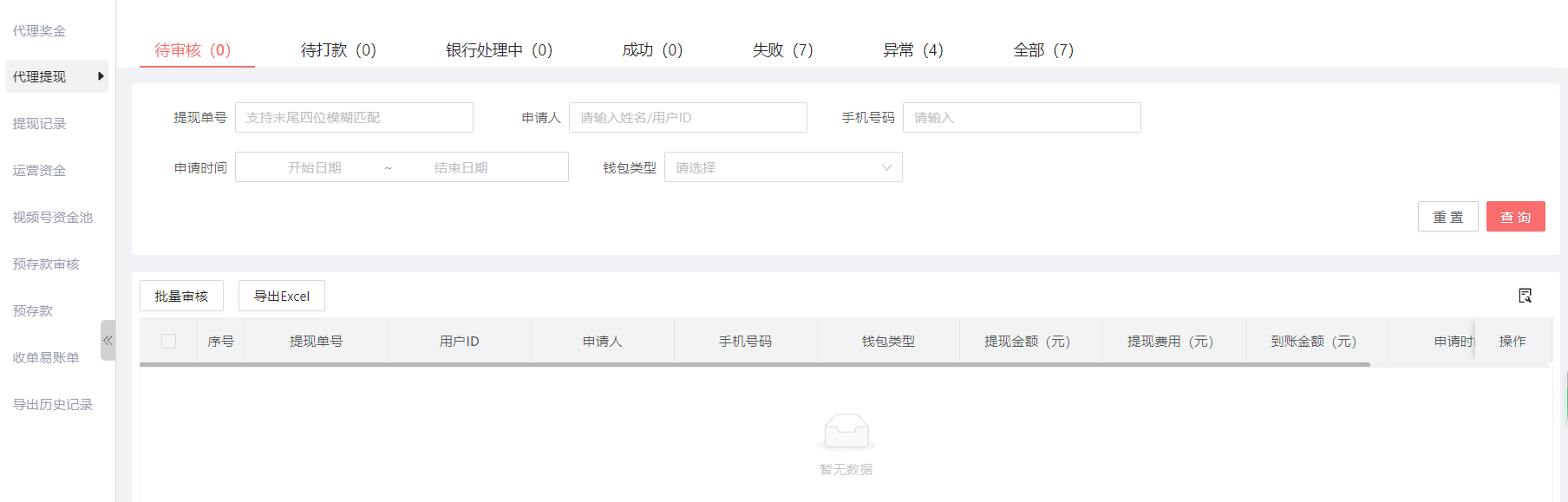 目录 搜索 展开 系统介绍管理端-PC首页看板店铺主题装修风格一商品专辑商品自营商品收单易商品商品分类品牌管理商品标签运费模板供应商仓库管理购买须知素材中心导出历史记录订单自营订单收单易订单收单易备货记录收单易异常订单视频号订单视频号异常订单备货记录导出记录快递单导入记录售后代理/用户 申请售后流程项目方后台申请售后流程售后列表售后地址管理导出历史记录用户代理列表注册用户考核准代理考核记录加盟审核黑/白名单导入用户导入用户历史操作日志财务用户奖金代理提现提现记录运营资金视频号资金池预存款审核预存款收单易账单直播视频号直播小程序直播播播熊直播小店带货机构机构商品机构分配达人佣金商家分配达人佣金合作商家商品合作内容合作合作达人商品合作内容合作合作品牌订单管理推客带货直播间短视频推客管理基础配置营销工具等级设置佣金设置系统设置视频号小店(微信小店)视频号分享营销商品类限时秒杀限时团购店铺类服务标签公告管理banner管理工具类优惠券积分中心活跃值排行榜跨境保税满包邮分享有礼积分兑换弹窗广告满减满送满赠日历签到购买有礼注册有礼储值有礼换购平台服务退换无忧补贴标准权限员工管理角色管理数据业绩统计商品统计设置项目设置代理关系平台展业分享设置代理设置代理须知设置升/降级设置商品设置订单设置售后设置客服设置奖金设置基础奖金单品团队奖团队业绩奖代理提现设置(独立版)项目方提现设置独立版提现非独立版提现加盟商品页设置操作日志管理端-小程序订单管理商品管理代理余额运营资金奖金支出所有代理订单网络同级网络推荐网络加盟审核代理排行榜预存款选品中心小程序直播退换无忧代理端-小程序我的订单奖金团队业绩工具 暂无相关搜索结果! view_count:159 本文档使用 MinDoc 发布 代理提现 代理提现;即每个代理提现的每一笔记录,还可以根据提现的状态,提现单号,申请人,手机号码等查询。根据代理提现设置,超出提现审核门槛金额的,需要审核的页面 代理提现设置,在设置,代理提现设置里面作者:admin 创建时间:2023-06-19 10:23最后编辑:admin 更新时间:2026-03-31 17:07