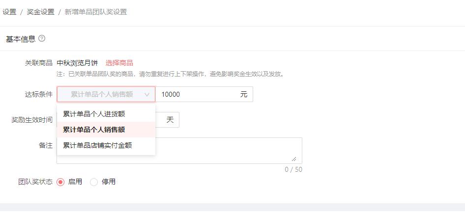 团队奖状态:启用,或者停用。
