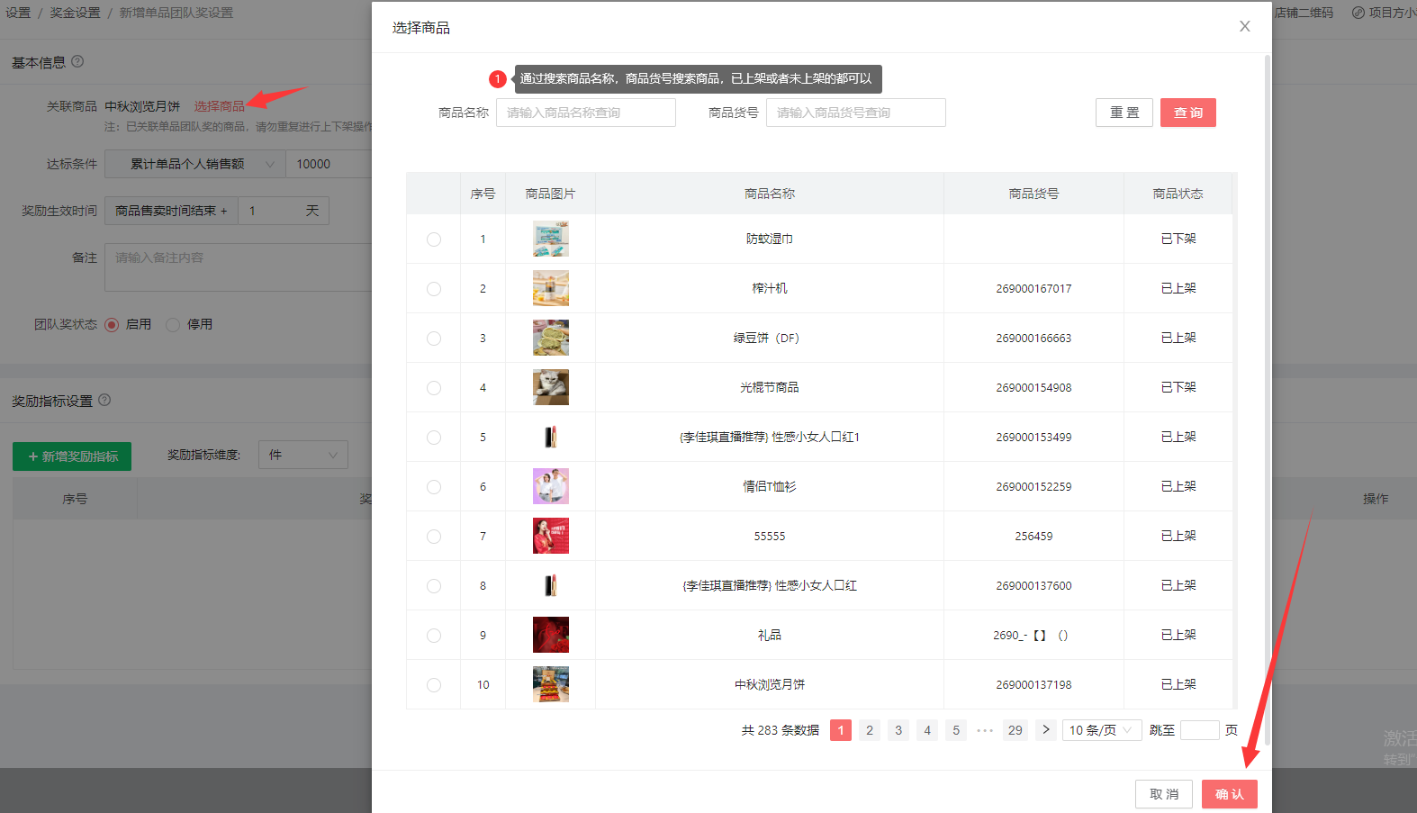通过搜索商品名称,商品货号搜索商品,已上架或者未上架的都可以,在点击确认。
