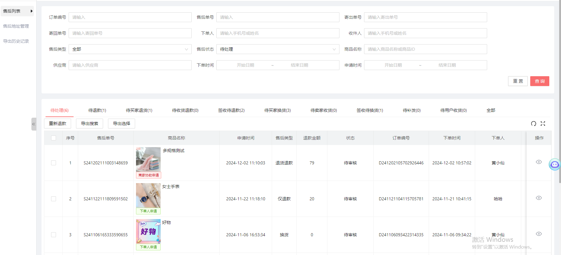 待处理:后台或者用户提交所有售后类型申请,需要后台审核处理的售后订单。