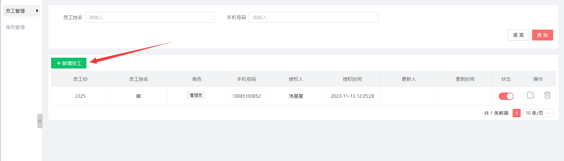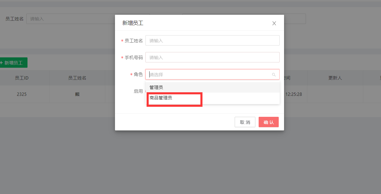 员工管理:主要是新增员工的,需要输入,名称,手机号和选择对应的角色名称点击新增员工, 输入姓名和手机号码,选择角色,之前命名的角色就可以看到并选择了 选择角色后,点击确认,即可完成。温馨提示:记得先去命名角色名称配置对应权限后,在给员工选择角色哦!作者:admin 创建时间:2024-07-05 11:49最后编辑:admin 更新时间:2026-03-31 17:07