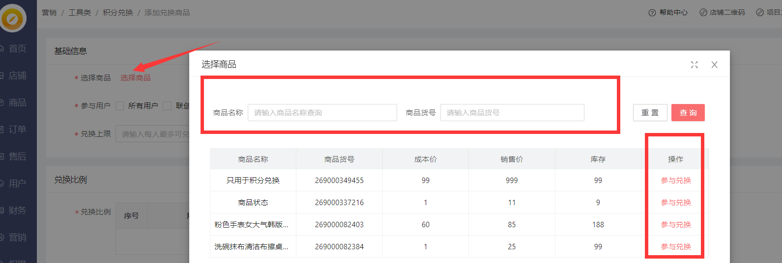 添加兑换商品:选择已经勾选积分兑换的商品