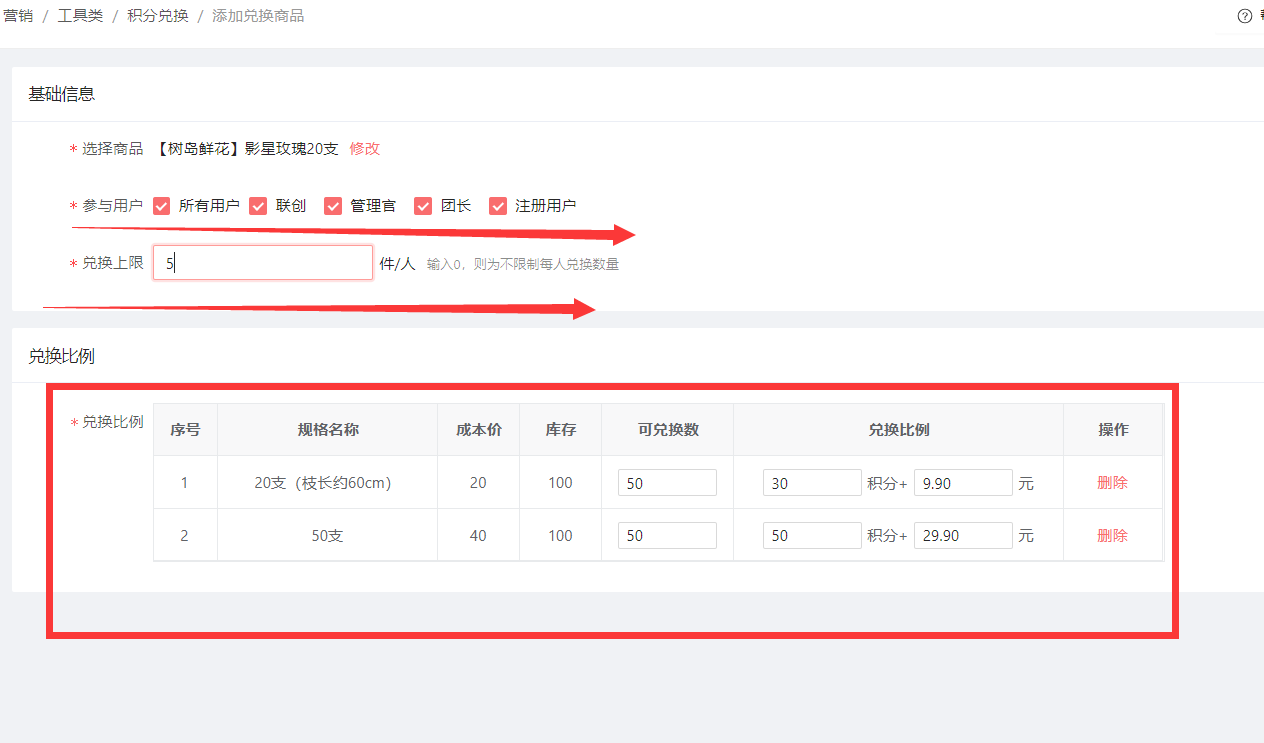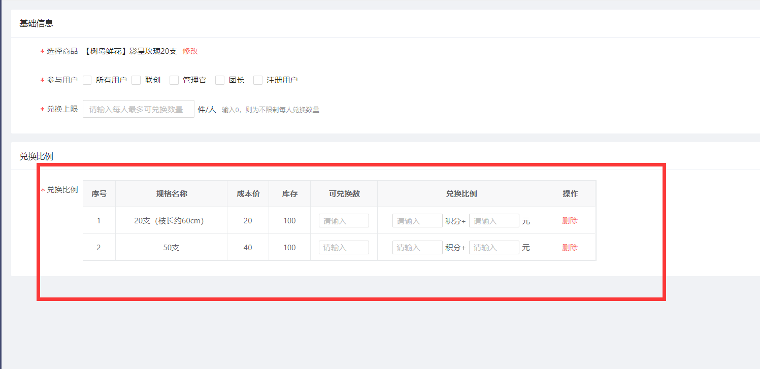 点击参与兑换:就可以设置对应的参与用户和兑换比例的数值。
