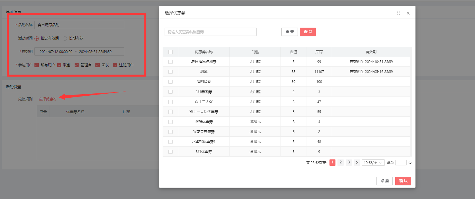 确认活动名称,选择参与用户,选择已经创建好的优惠券