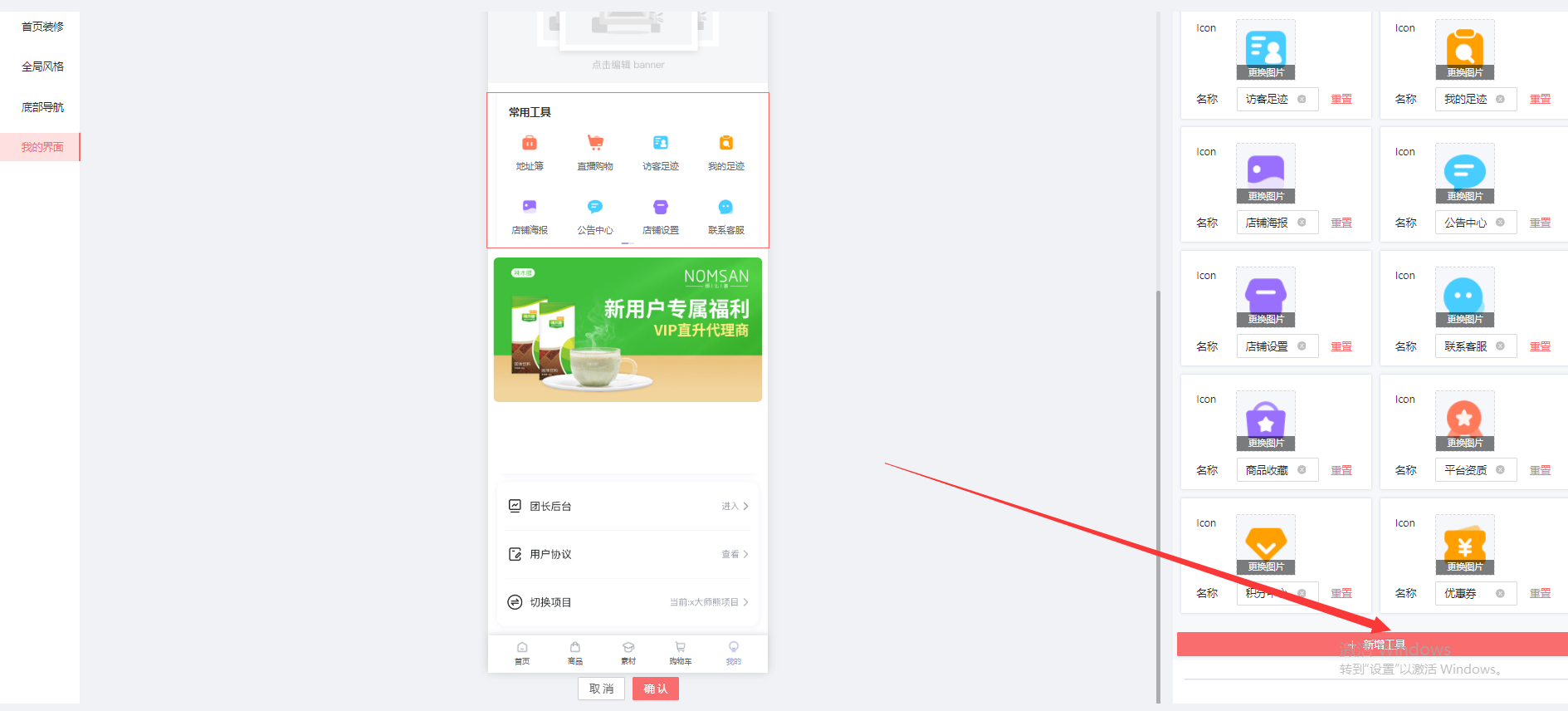 在PC端-店铺-主题装修-找到现在使用的皮肤风格,点击配置,我的页面-常用工具-新增工具