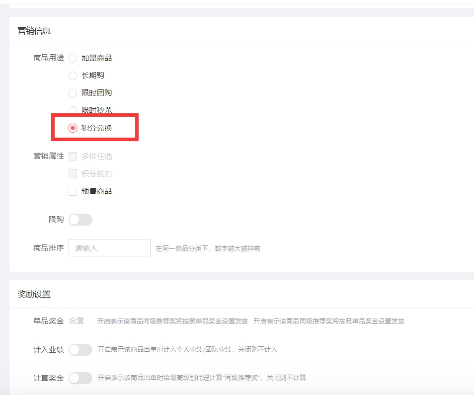 新增商品-在营销信息-商品用途-勾选-积分兑换
