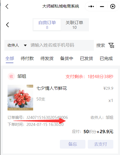 订单支付成功后,这种积分兑换支付的订单,订单编号是以“J24”开头的
