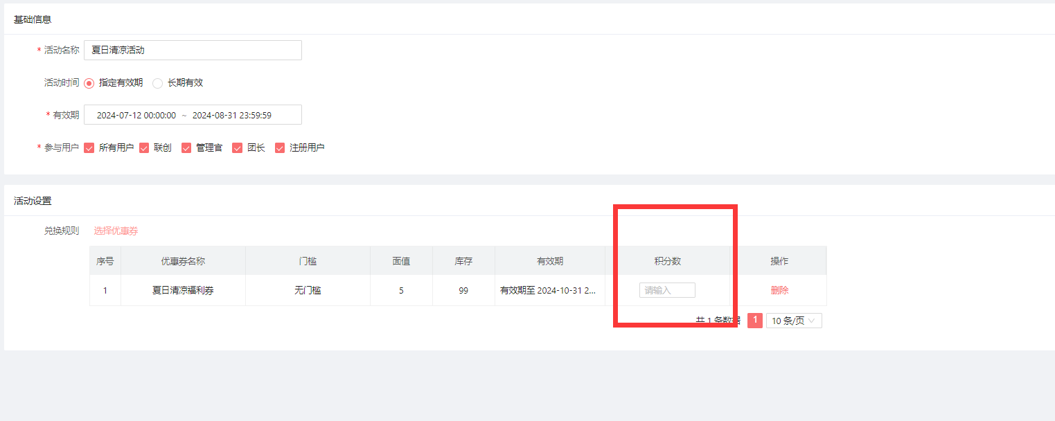 然后设置这个优惠券,可以使用积分兑换的数值。
