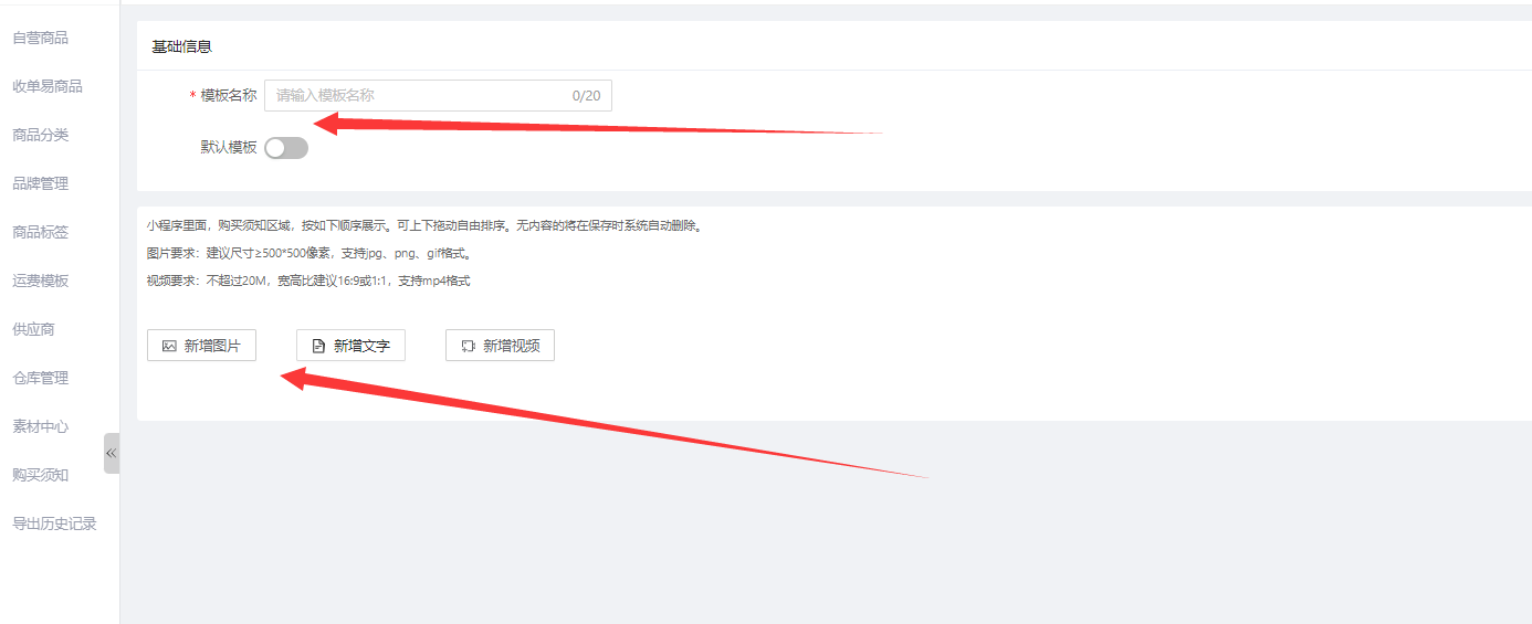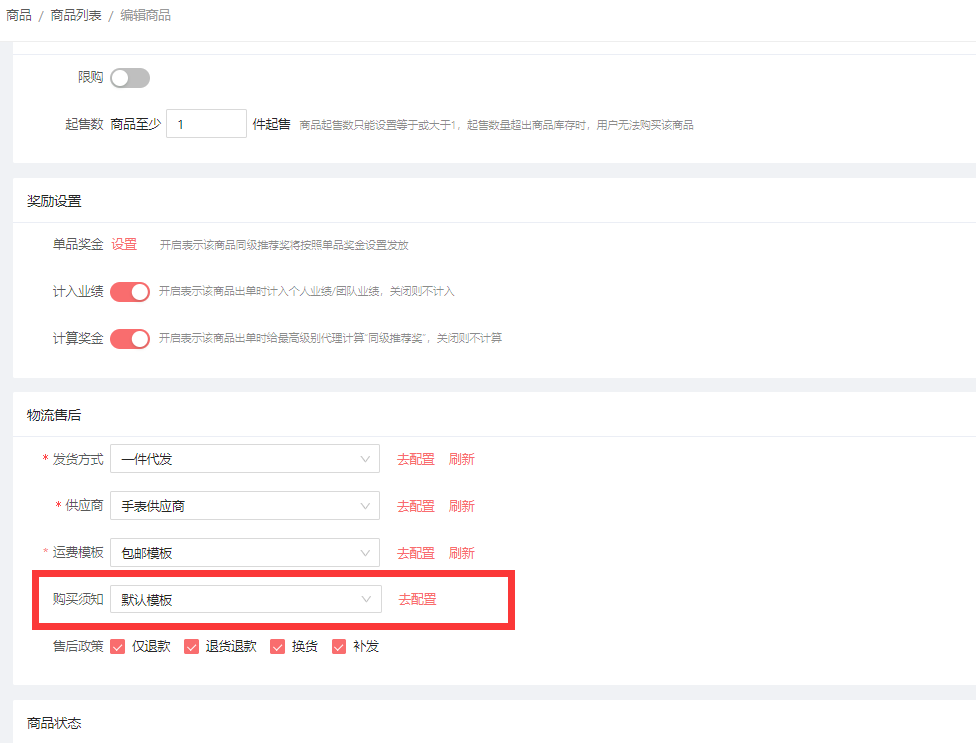 目录 搜索 展开 系统介绍管理端-PC首页看板店铺主题装修风格一商品专辑商品自营商品收单易商品商品分类品牌管理商品标签运费模板供应商仓库管理购买须知素材中心导出历史记录订单自营订单收单易订单收单易备货记录收单易异常订单视频号订单视频号异常订单备货记录导出记录快递单导入记录售后代理/用户 申请售后流程项目方后台申请售后流程售后列表售后地址管理导出历史记录用户代理列表注册用户考核准代理考核记录加盟审核黑/白名单导入用户导入用户历史操作日志财务用户奖金代理提现提现记录运营资金视频号资金池预存款审核预存款收单易账单直播视频号直播小程序直播播播熊直播小店带货机构机构商品机构分配达人佣金商家分配达人佣金合作商家商品合作内容合作合作达人商品合作内容合作合作品牌订单管理推客带货直播间短视频推客管理基础配置营销工具等级设置佣金设置系统设置视频号小店(微信小店)视频号分享营销商品类限时秒杀限时团购店铺类服务标签公告管理banner管理工具类优惠券积分中心活跃值排行榜跨境保税满包邮分享有礼积分兑换弹窗广告满减满送满赠日历签到购买有礼注册有礼储值有礼换购平台服务退换无忧补贴标准权限员工管理角色管理数据业绩统计商品统计设置项目设置代理关系平台展业分享设置代理设置代理须知设置升/降级设置商品设置订单设置售后设置客服设置奖金设置基础奖金单品团队奖团队业绩奖代理提现设置(独立版)项目方提现设置独立版提现非独立版提现加盟商品页设置操作日志管理端-小程序订单管理商品管理代理余额运营资金奖金支出所有代理订单网络同级网络推荐网络加盟审核代理排行榜预存款选品中心小程序直播退换无忧代理端-小程序我的订单奖金团队业绩工具 暂无相关搜索结果! view_count:91 本文档使用 MinDoc 发布 购买须知 购买须知:即针对商品的信息,例如售后退换货的规则,快递发货等,展示在商品详情旁边,名称:购买须知。先新增须知: 上传信息,保存。可以针对每个商品都可以对应创建一个购买须知的,在新增商品的时候,购买须知那,就可以选择创建好的。作者:admin 创建时间:2024-08-07 11:38最后编辑:admin 更新时间:2026-03-31 17:07