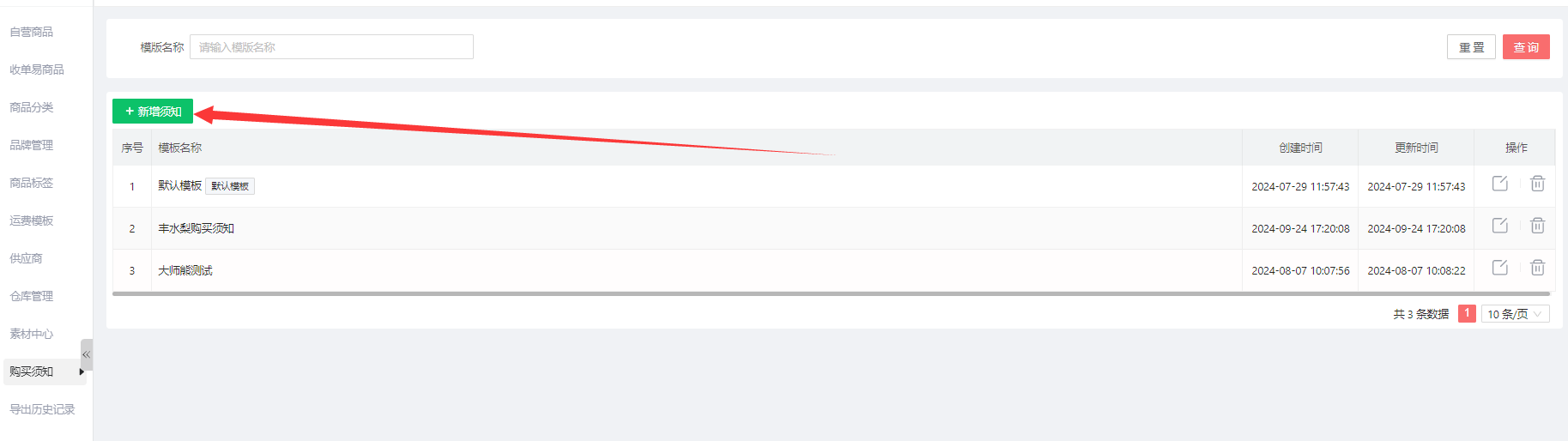 购买须知:即针对商品的信息,例如售后退换货的规则,快递发货等,展示在商品详情旁边,名称:购买须知。先新增须知: 上传信息,保存。可以针对每个商品都可以对应创建一个购买须知的,在新增商品的时候,购买须知那,就可以选择创建好的。作者:admin 创建时间:2024-08-07 11:38最后编辑:admin 更新时间:2026-03-31 17:07